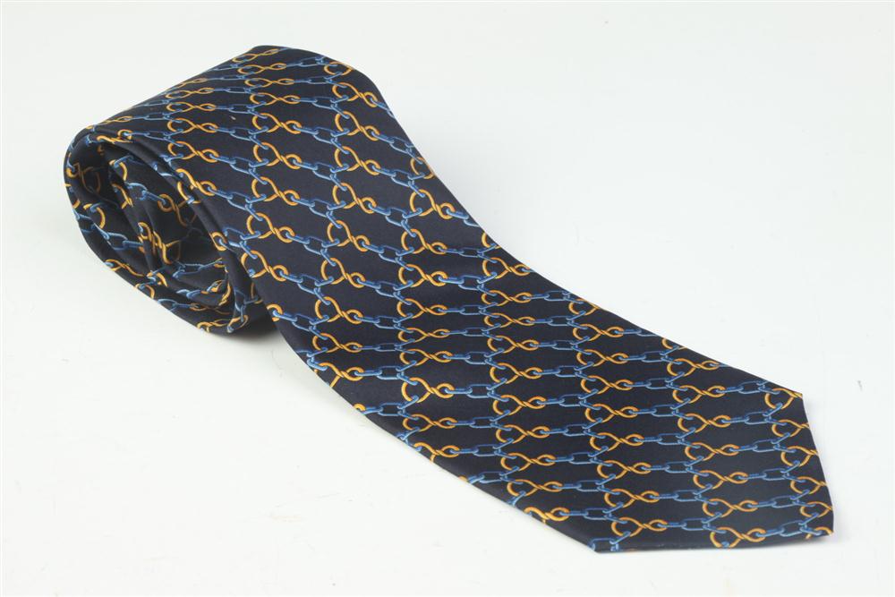 GUCCI SILK TIE. Navy blue ground with blue and gold pattern Estimate $20-40