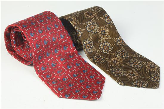 TWO FENDI SILK TIES. One, olive green with gold and blue foliate pattern; one, red with blue and silver pattern Estimate $100-150
