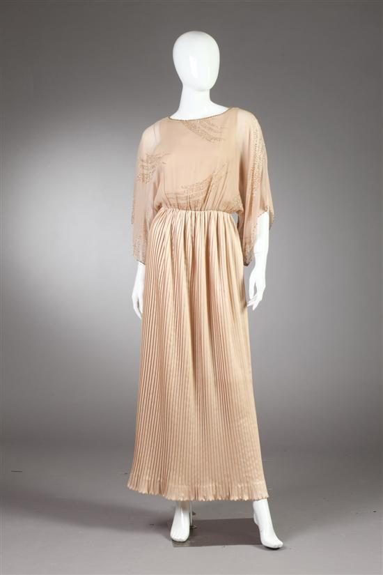 HANAE MORI CHAMPAGNE EVENING DRESS,1980s; size 6. Lined bodice with butterfly sleeves, with gold beading and applied sequin clusters; descending into long pleated skirt Estimate $150-300