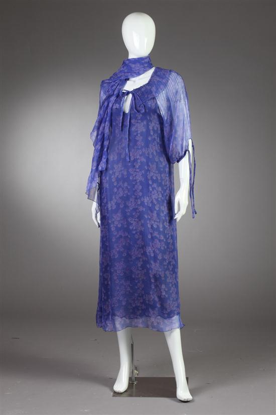 ANNA WEATHERLEY CHIFFON DRESS AND SCARF, Retailed Washington, DC; size M. Iolite ground with purple floral pattern; A-line, with ties at neck and 3/4 length sleeves Estimate $100-150
