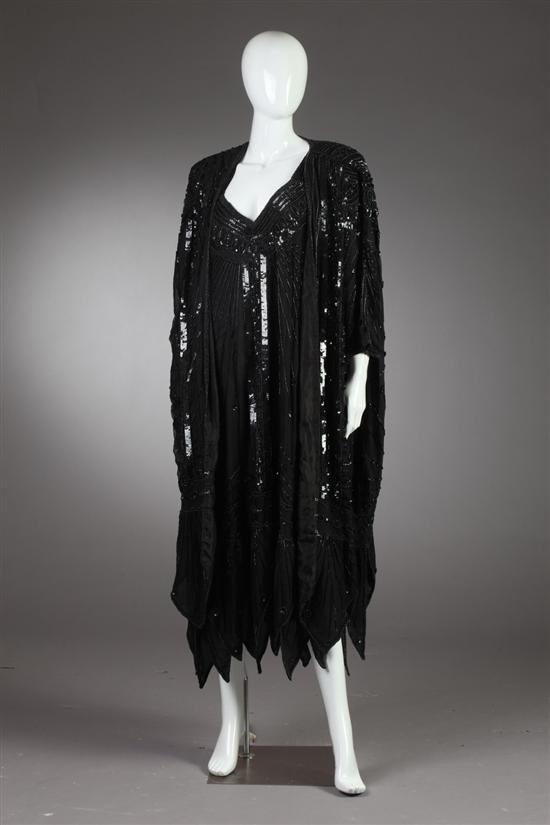 FLAPPER-STYLE BLACK BEADED DRESS AND LONG JACKET. Sleeveless, drop-waisted dress, with uneven hemline; matching jacket. Each with black beaded and sequin decoration allover Estimate $150-250