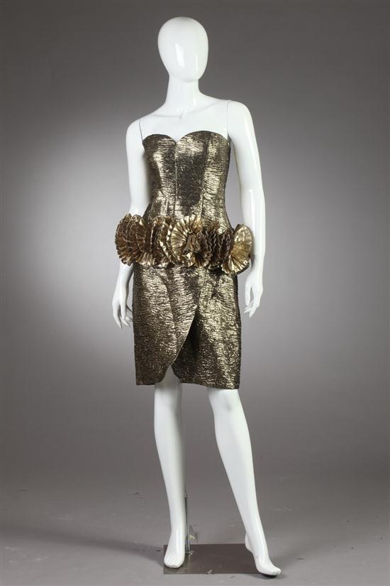VICTOR COSTA GOLD LAMÉ COCKTAIL DRESS. Size 6. Strapless sweetheart bodice, straight skirt; pleated fans encircling the waist Estimate $75-125