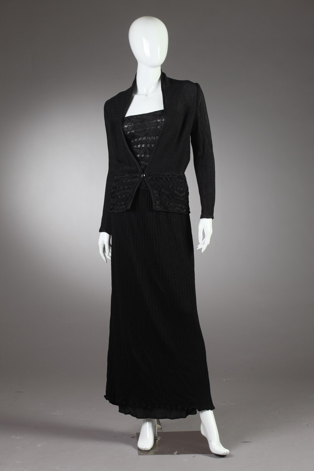 MISSONI BLACK CROCHET EVENING ENSEMBLE. 1970s, size 40; retailed Bloomingdale's. Comprising skirt, camisole and jacket Estimate $125-200