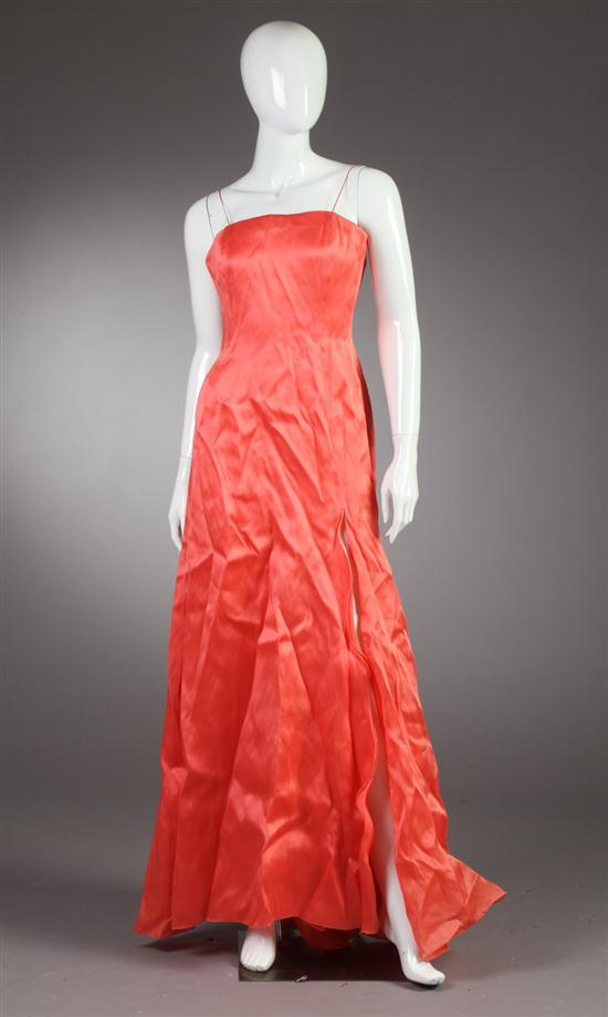 ANGEL SANCHEZ CORAL SILK GOWN. Size 8. Fitted bodice; the flowing skirt with multiple ruffled slits Estimate $150-250