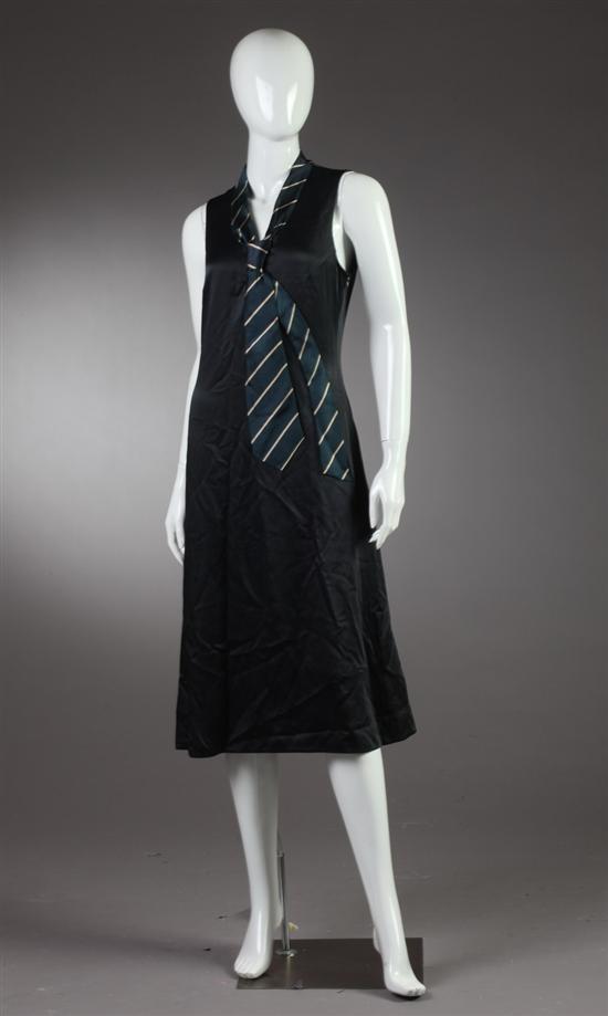 MIGUEL ADROVER NAVY DRESS. Size 8. Sleeveless shift, gentle A-line shape; with attached navy and cream striped silk tie Estimate $100-200