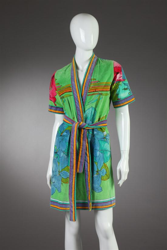 LEONARD FASHION COTTON TERRY CLOTH POOLSIDE ROBE AND BELT. Early 1970s; signed within fabric. In vibrant floral pattern incorporating a mix of colors including lime green, magenta, purple and blue Estimate $100-150