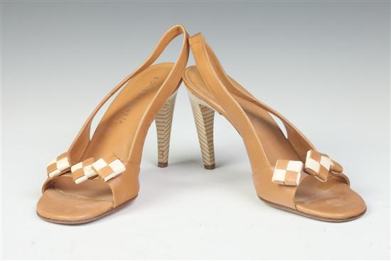 BOTTEGA VENETTA CAMEL AND CREAM LEATHER HEELS, Size 38. Estimate $50-75