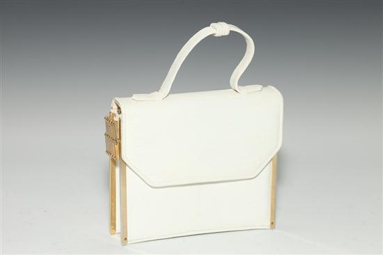 JUDITH LEIBER WHITE SNAKESKIN HANDBAG. White fabric interior; gold-tone accordion side mounts - 5 3/4 in. x 6 3/4 in. x 1 3/4 in. Estimate $200-400