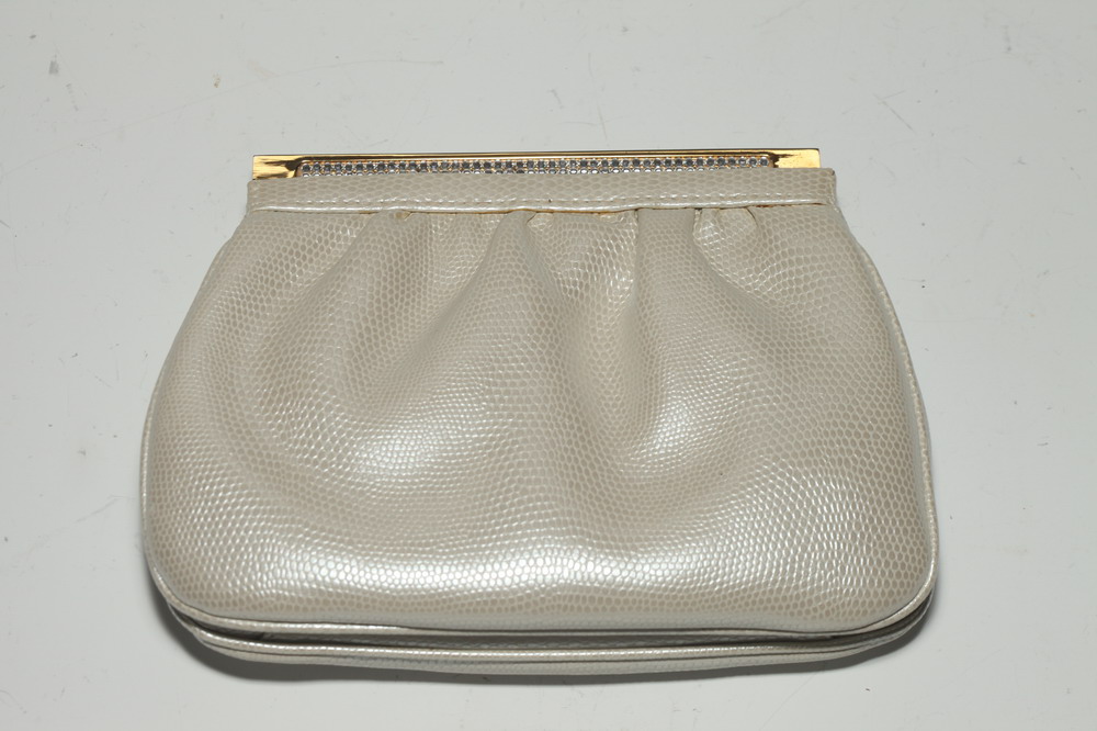 JUDITH LEIBER EMBOSSED PEARLESCENT LEATHER EVENING BAG. Gold-tone mount set with colorless crystals; white leather interior. Includes optional shoulder chain, pocket mirror - 5 3/4 in. x 8 in. Estimate $150-250