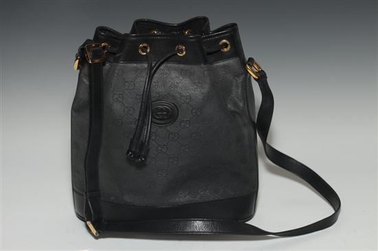 GUCCI BLACK LEATHER-TRIMMED MONOGRAMMED CANVAS BUCKET BAG. - 10 1/2 in. x 9 3/4 in. x 4 1/4 in. Estimate $200-400