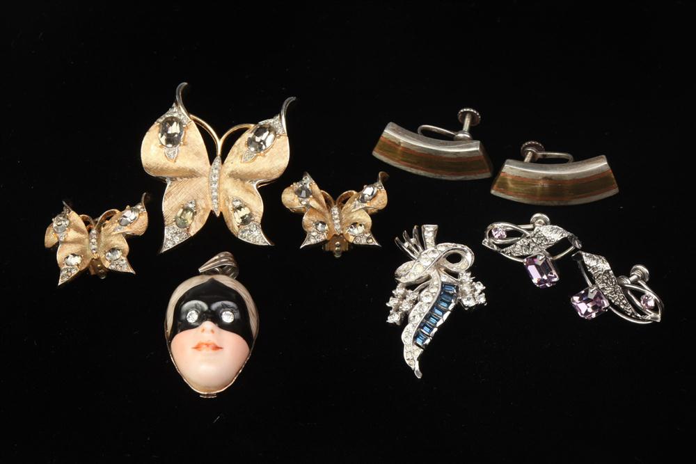 FIVE ASSORTED ITEMS JEWELRY. Including painted porcelain mask form locket; pair signed "Castillo" Mexican silver, copper and brass crescent shape, clip-back earrings; pair Van Dell sterling mounted faux amethyst screw-back earrings; rhinestone costume pin; and three-piece suite Trifari rhinestone mounted butterfly pin with pair matching clip-back earrings Estimate $60-90