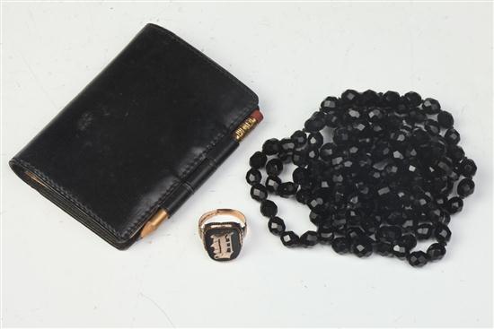 Sale 78 Lot 275 THREE ASSORTED ITEMS VINTAGE JEWELRY AND ACCESSORIES. 1949 Hermès, Paris, black leather pocket agenda; 60" matched faceted oval jet bead endless-strand necklace; and Victorian yellow gold old English script initial ring, size 10 Estimate $100-150 Sold for $110