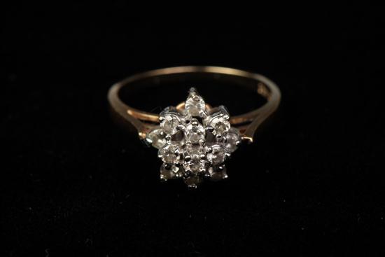14K YELLOW AND WHITE GOLD AND DIAMOND CLUSTER RING. Tiered cluster of 13 matched round diamonds. Size: 5 1/2 Estimate $100-150
