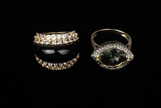 TWO 14K YELLOW GOLD AND GEMSTONE RINGS. Black onyx and faux diamond dome ring, size 6; pale green marquise shape gemstone ring with navette shape setting edged with melee diamonds, Size 8 Estimate $125-175