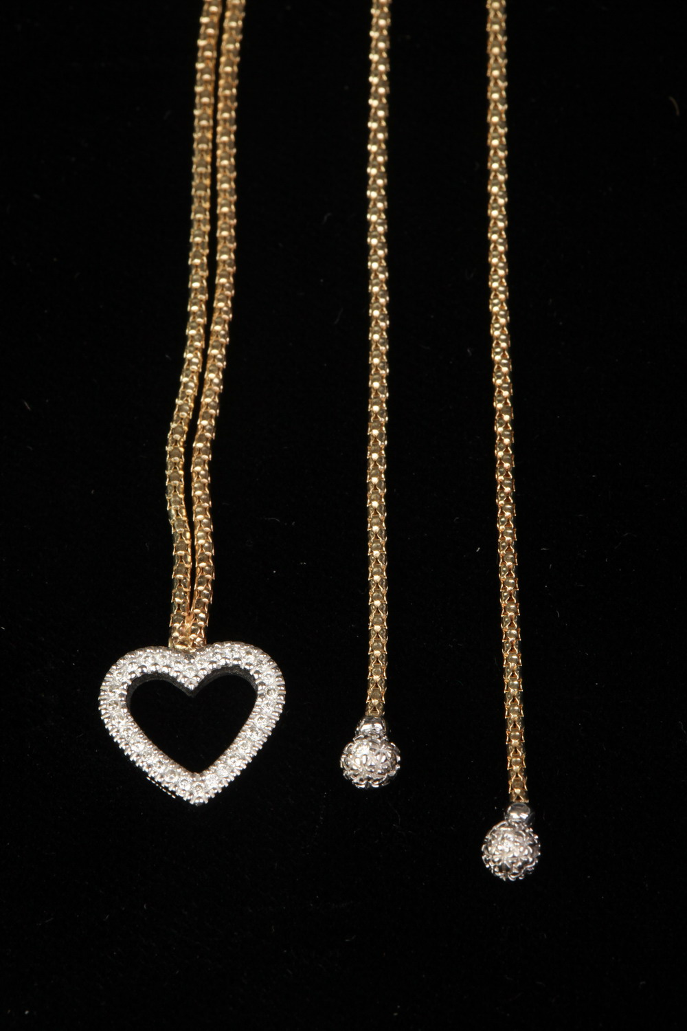 14K YELLOW AND WHITE GOLD AND DIAMOND DELICATE LARIAT STYLE NECKLACE. Flexible-link tubular chain with diamond-set ball terminals and heart shape ornament Estimate $200-300