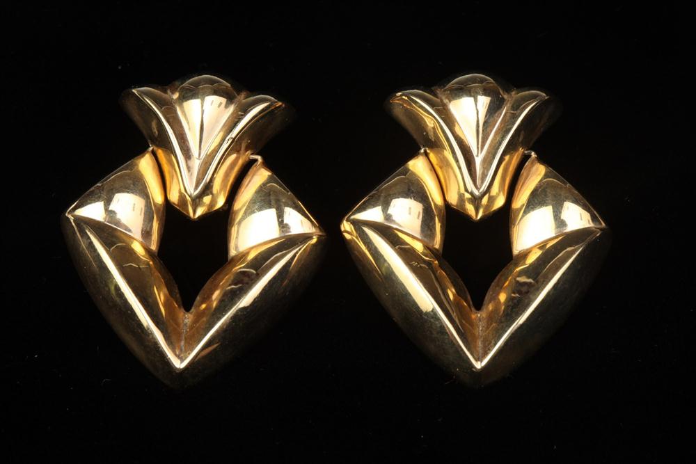PAIR 14K YELLOW GOLD SCULPTED GEOMETRIC DOOR KNOCKER EARRINGS. Post backs with safety clips. L: 1 7/8" Estimate $250-350