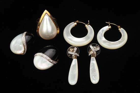 FOUR ITEMS 14K YELLOW GOLD AND MOTHER-OF-PEARL JEWELRY. Including pair drop form post-back earrings, pair round hoops, pair black onyx and mother-of-pearl oval post-clip earrings, and pear shape mabe pearl ring, size 7 Estimate $300-400