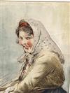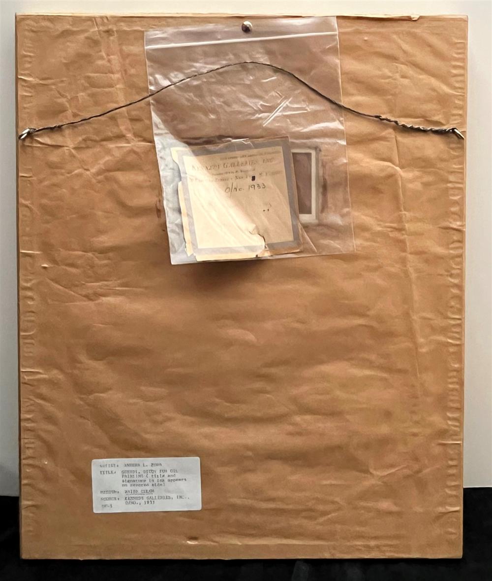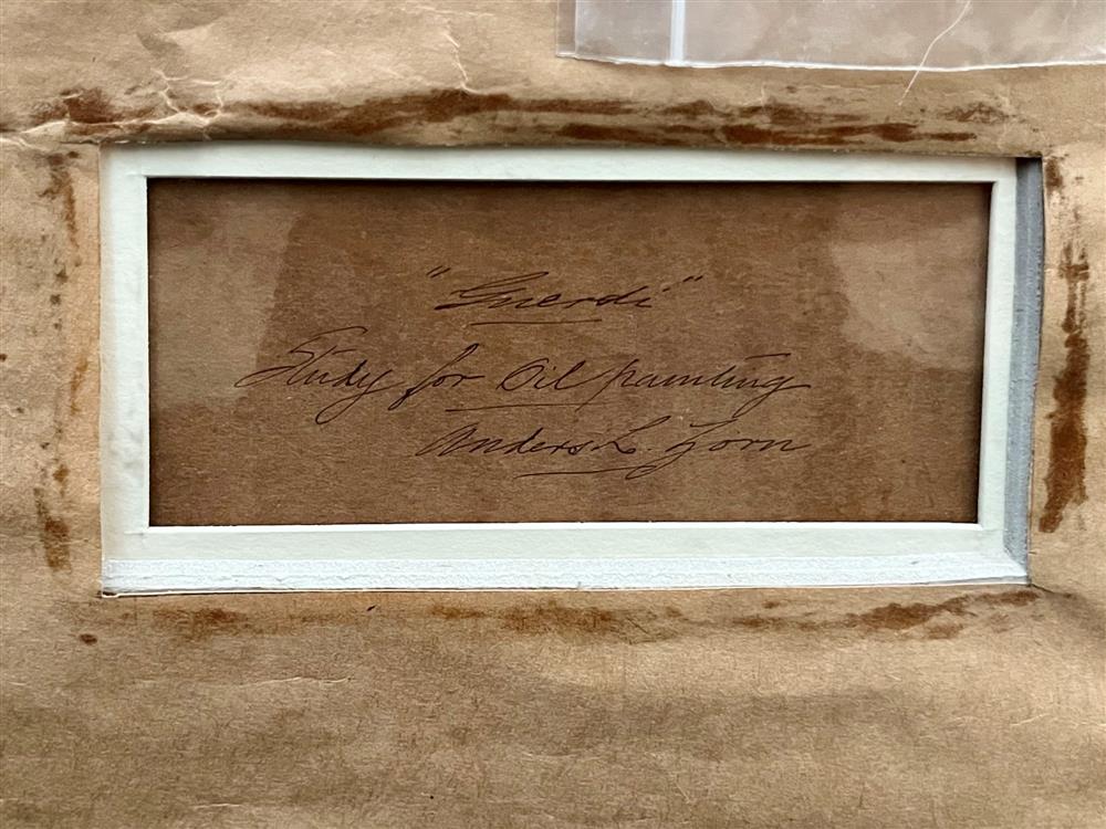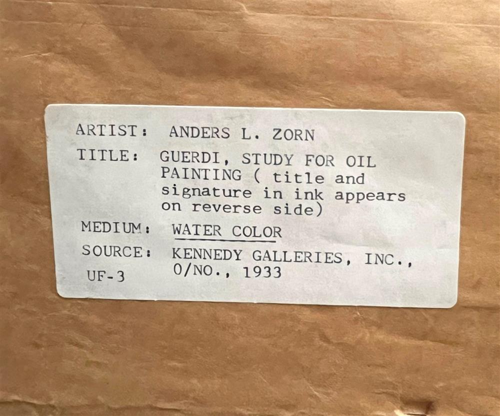 AFTER ANDERS L. ZORN (Swedish, 1860-1920). "Guerdi, Study for Oil Painting," 1933. Signed upper left; title and signature in ink appears on reverse side. Watercolor on paper. Accompanied by Kennedy Galleries, Inc., NY, label from original frame, noting inventory no. 1933. Framed. Not examined out of frame. - Sight (as matted): 12 ½" x 9 ½". Estimate $700-1,200