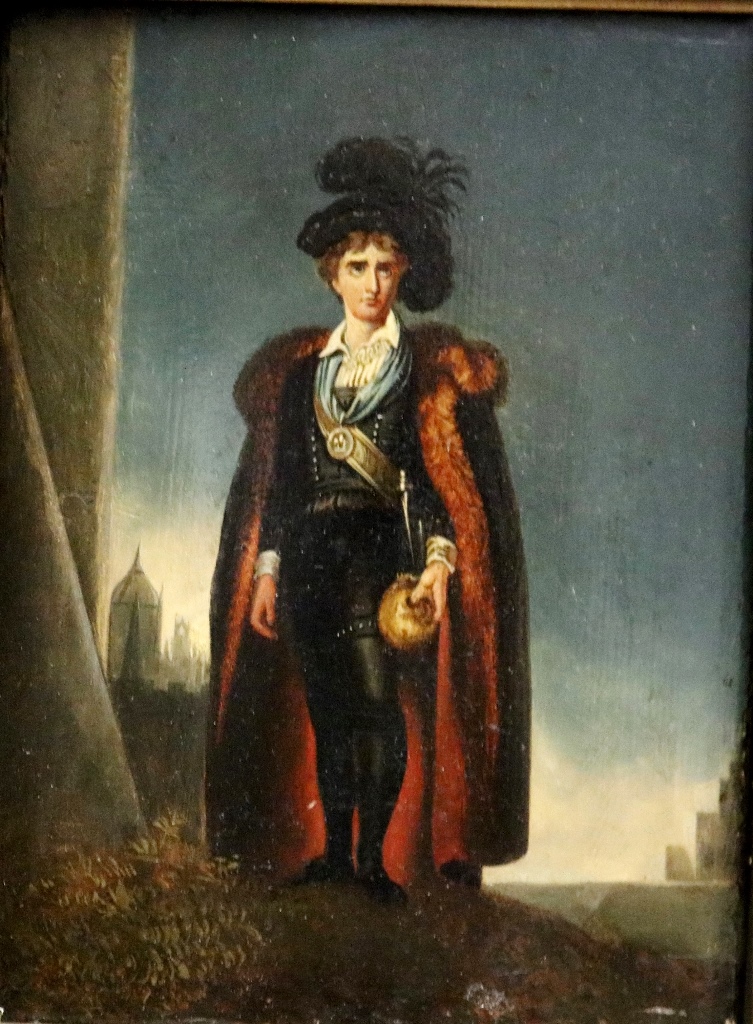 AFTER SIR THOMAS LAWRENCE (English, 19th century). John Philip Kemble as Hamlet, Oil on board. Unsigned. Framed. - Sight (approx.): 7.75 X 5.75 inches; frame: 13 X 11.5 inches.Estimate $100-150
