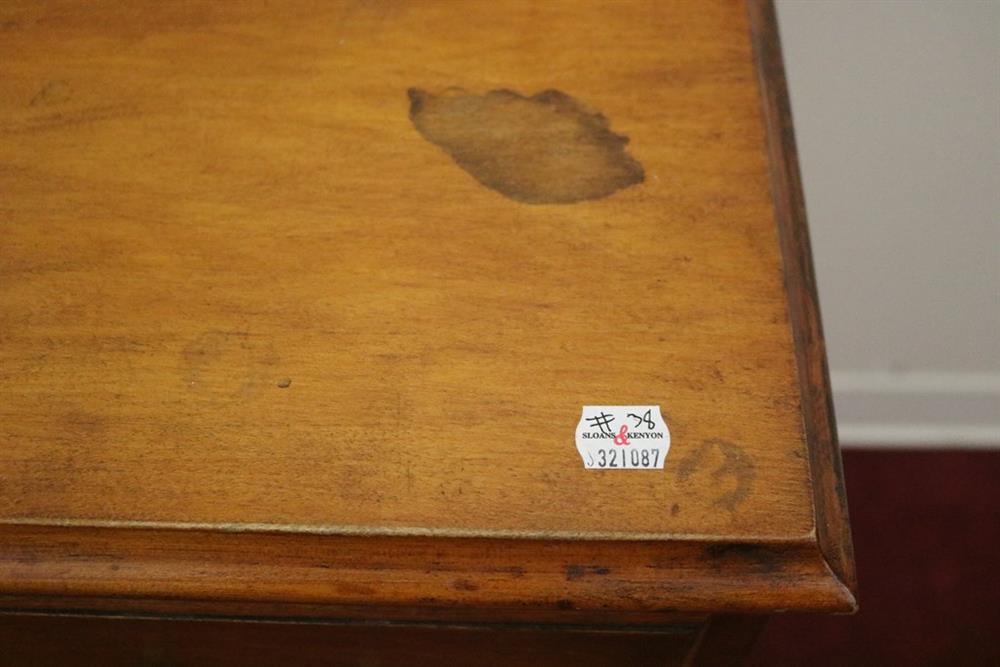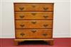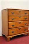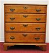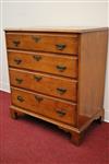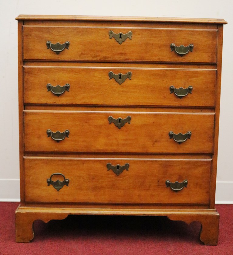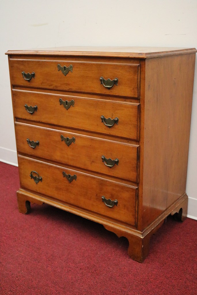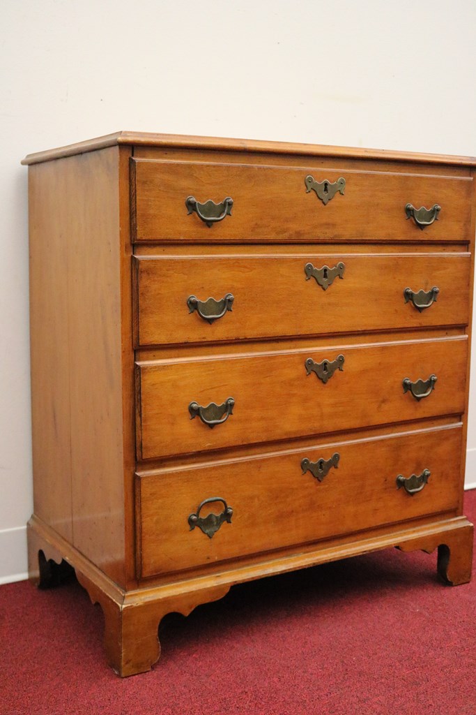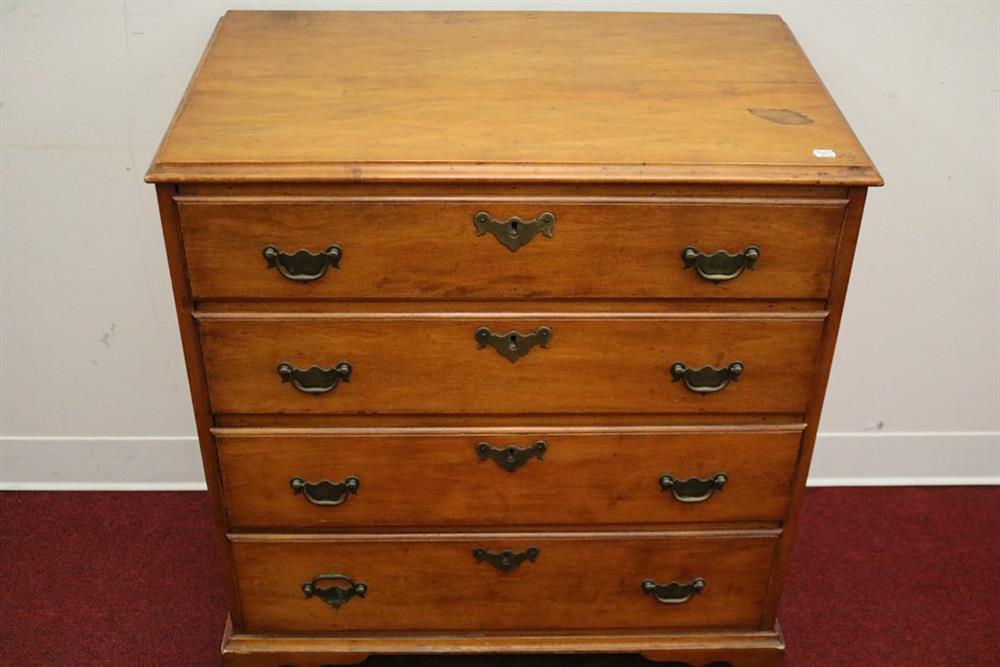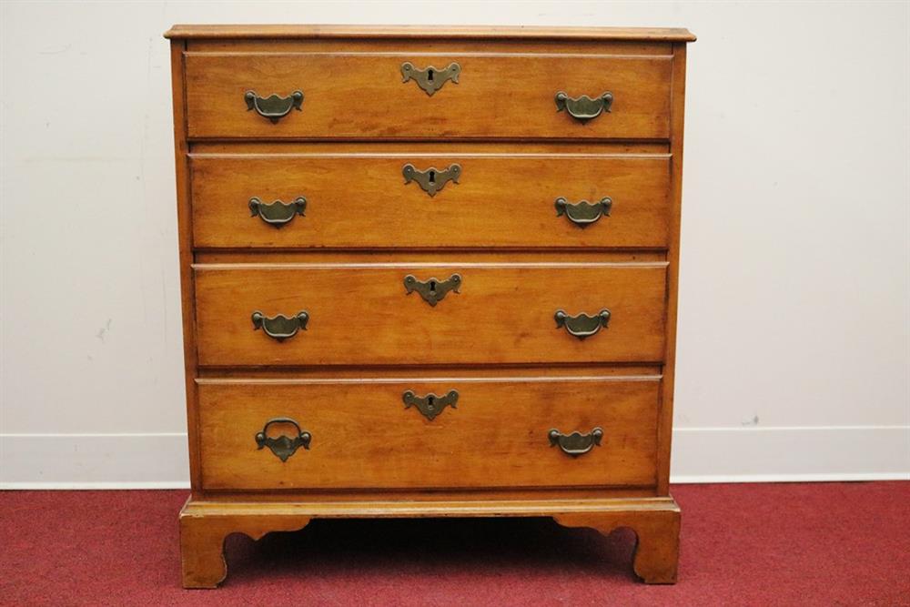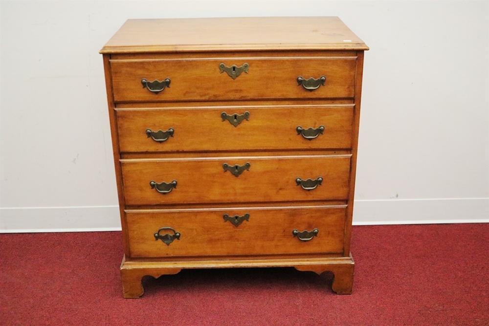 AMERICAN CHIPPENDALE MAPLE FOUR-DRAWER CHEST. Rectangular top with molded edge projects over four thumbnail molded, graduated full-width drawers; bracket feet. - H: 31 1/4". W: 28". D: 17".Estimate $300-400