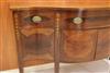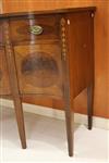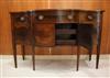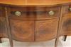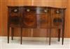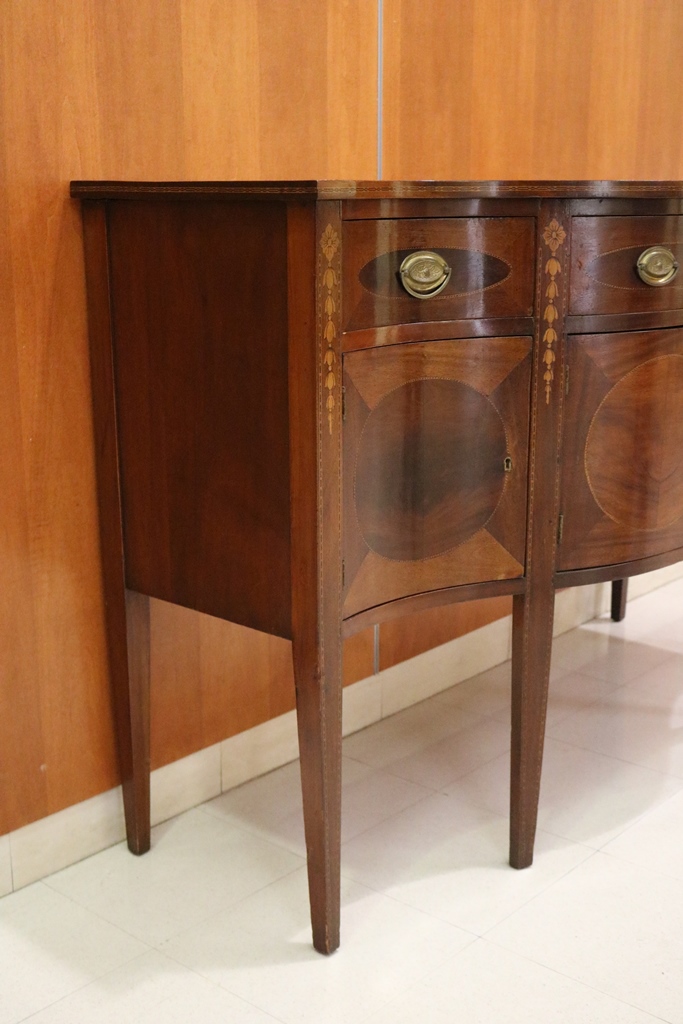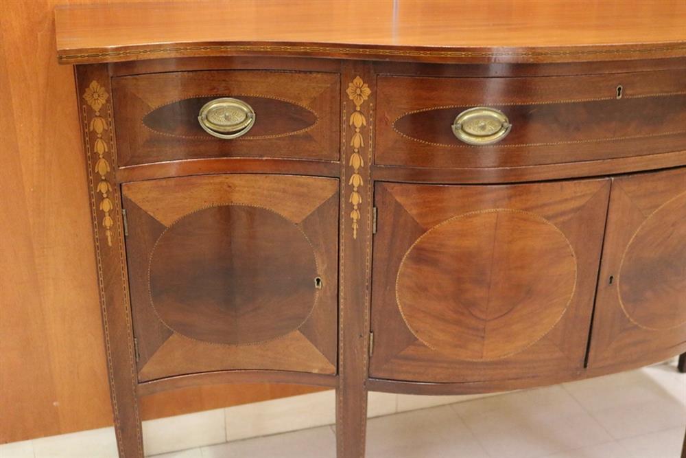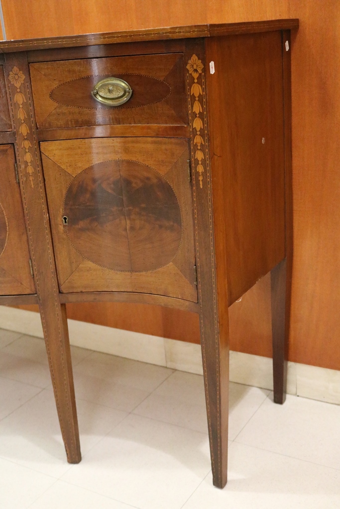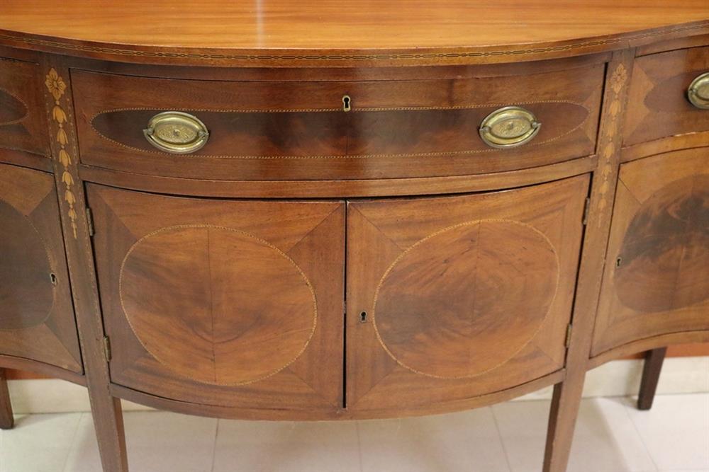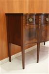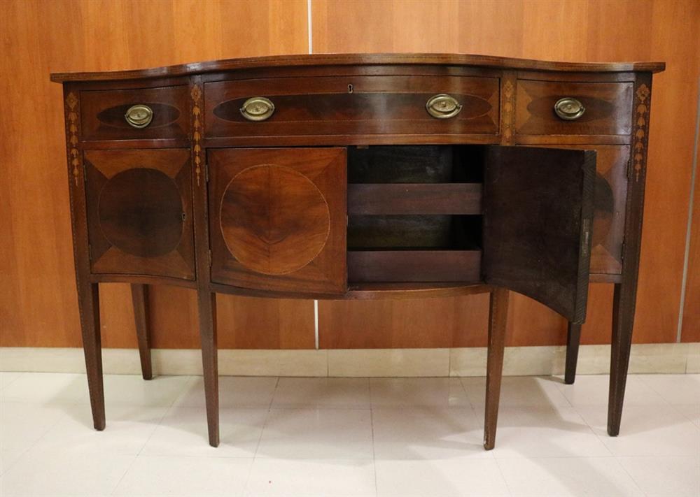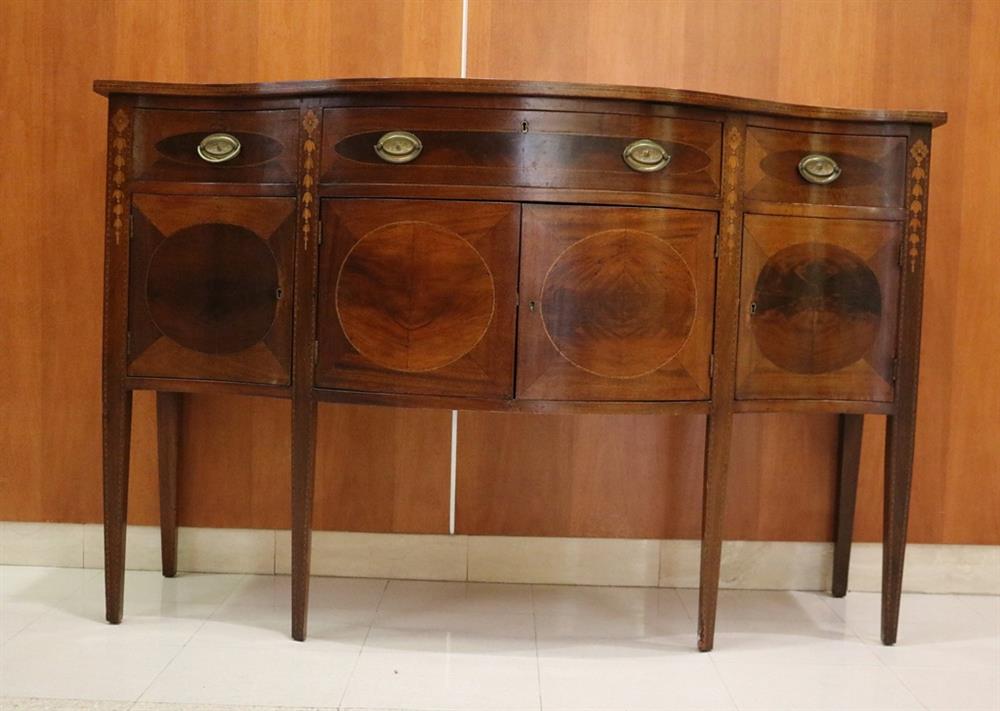 AMERICAN HEPPLEWHITE INLAID MAHOGANY SERPENTINE-FRONT SIDEBOARD. Three drawers over four cabinet doors, all with flush paneling outlined by striped inlay; six bell-flower inlaid tapering square legs. - H: 37 3/4". W: 59 1/4". D: 23". Estimate $800-1,200