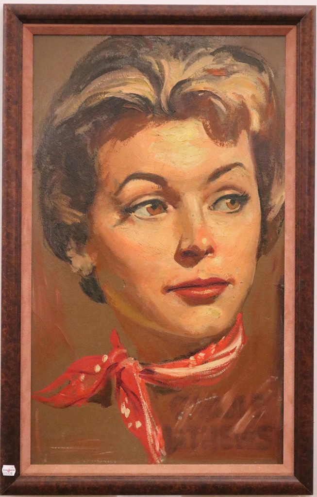 AMERICAN SCHOOL (20th century). CAROLE MATHEWS FROM GIRL OF SUMMER, 1995, Inscribed by sitter. Oil on board. Framed. - 28" x 16.5"; Frame: 30.5" x 19.5" Estimate $120-160 Carole Mathews starred with Mike Conners in the films "Girl of Summer" and "Swamp Women."