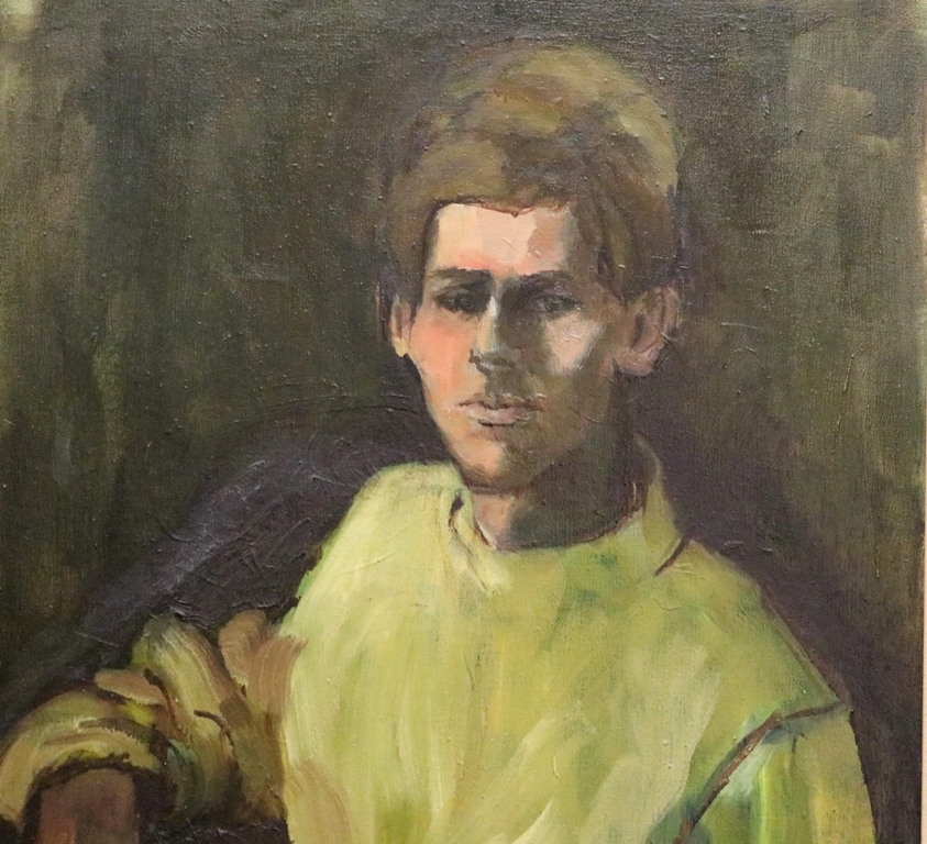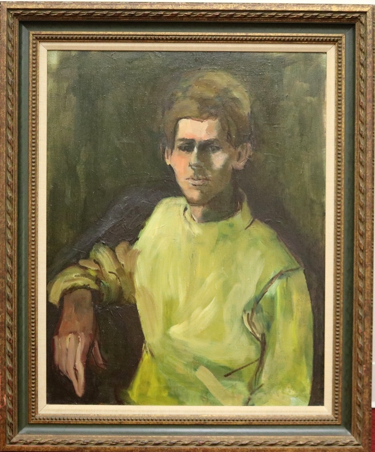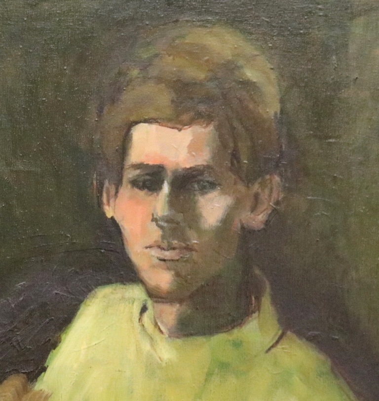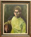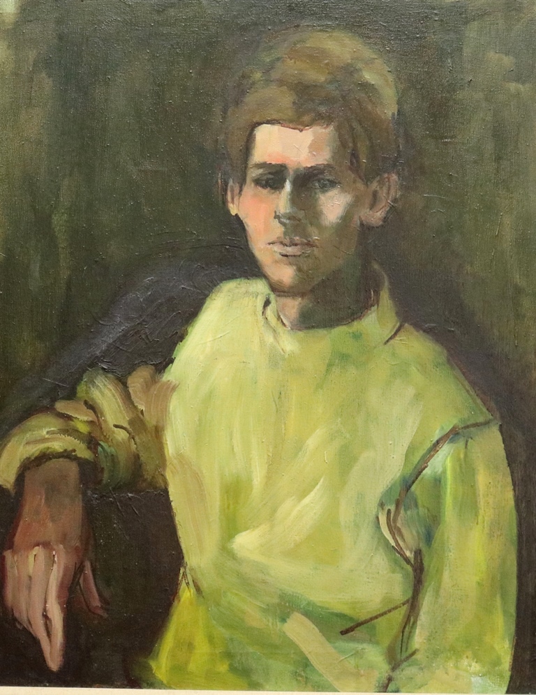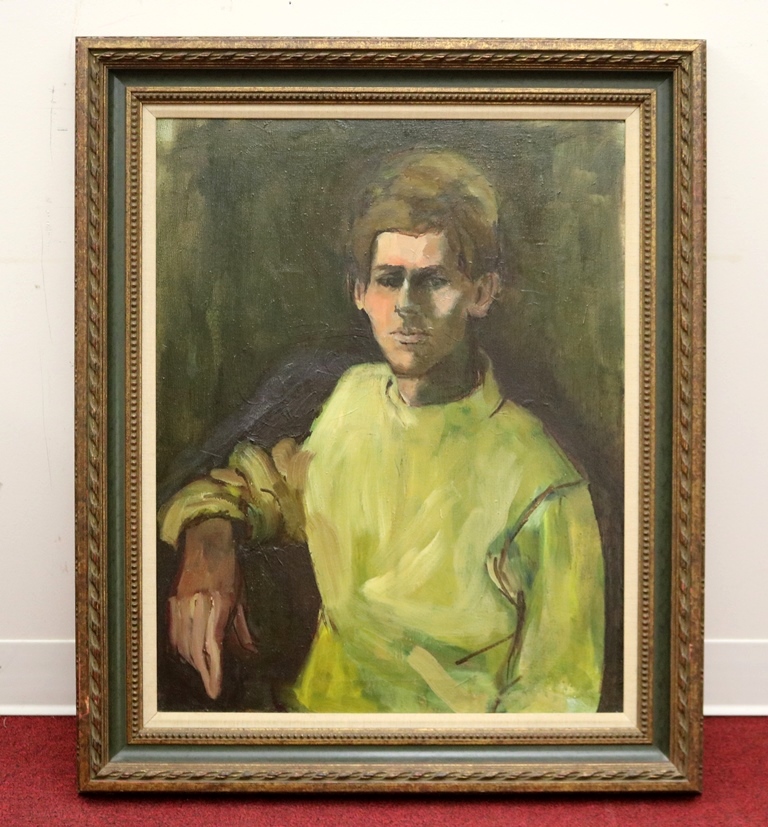 AMERICAN SCHOOL (20th century). Potrait of a young man in a yellow pullover, Oil on canvas. Unsigned. Framed. - 28 x 21 inches; frame: 35 x 29 inches
