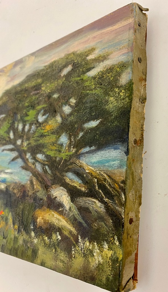 AMERICAN SCHOOL (early 20th Century). Seascape With Windblown Cypress On California Coast, circa 1925, Oil on canvas. Indecipherable signature at lower left hand corner. Possibly signed as "E. Gray Horan" and dated 1925. Verso indecipherable inscription and dated 1925. Framed (not engaged). - 8 x 11 in; frame: 10 x 13 in Estimate $400-600