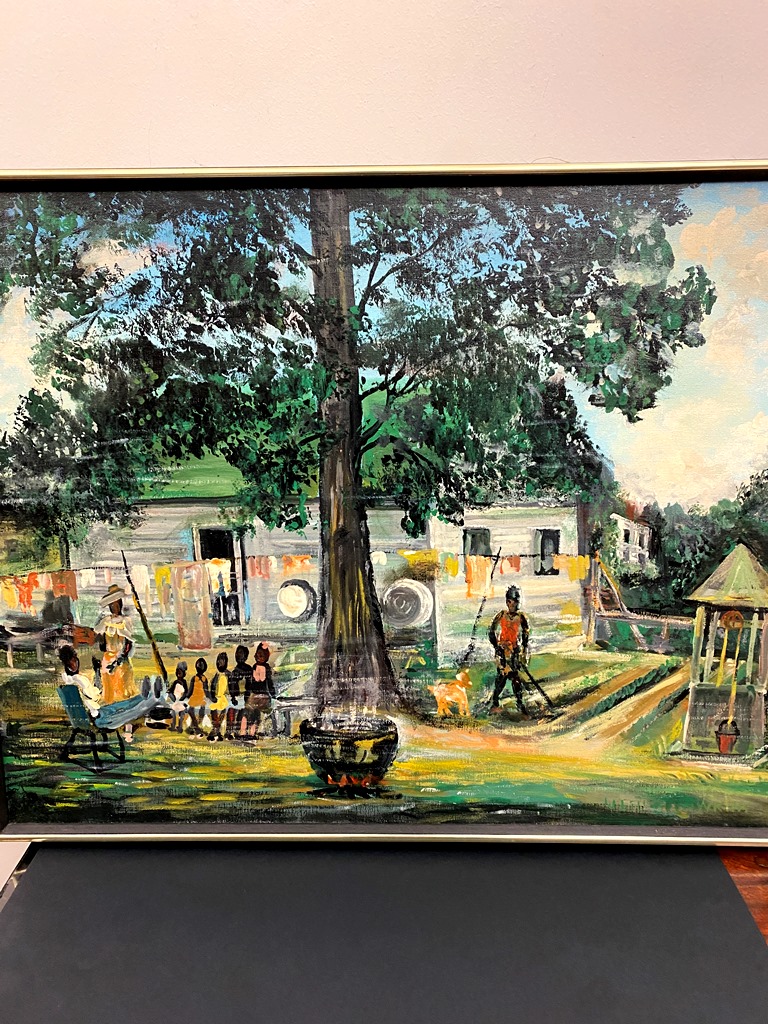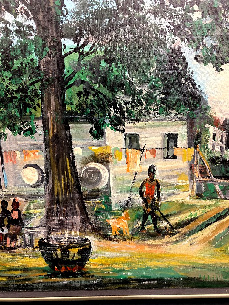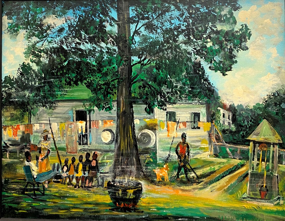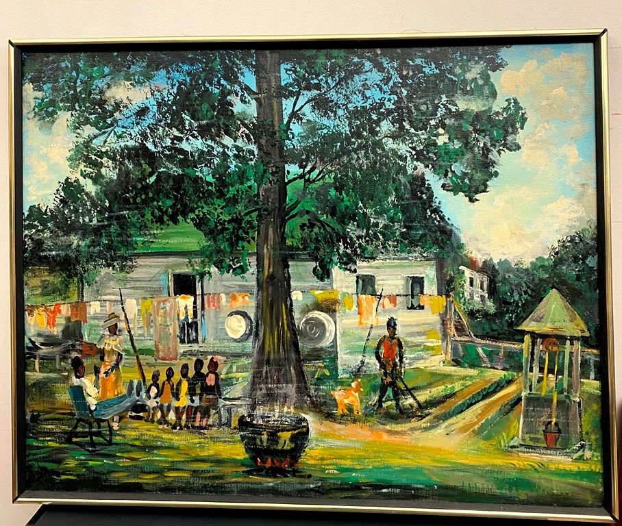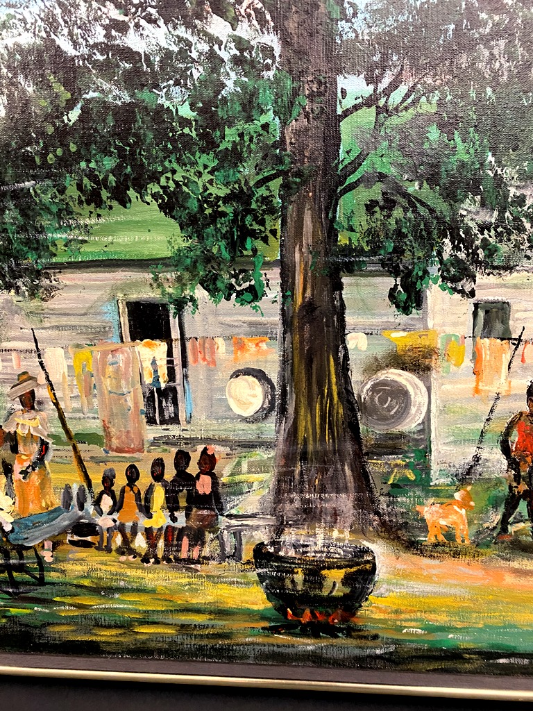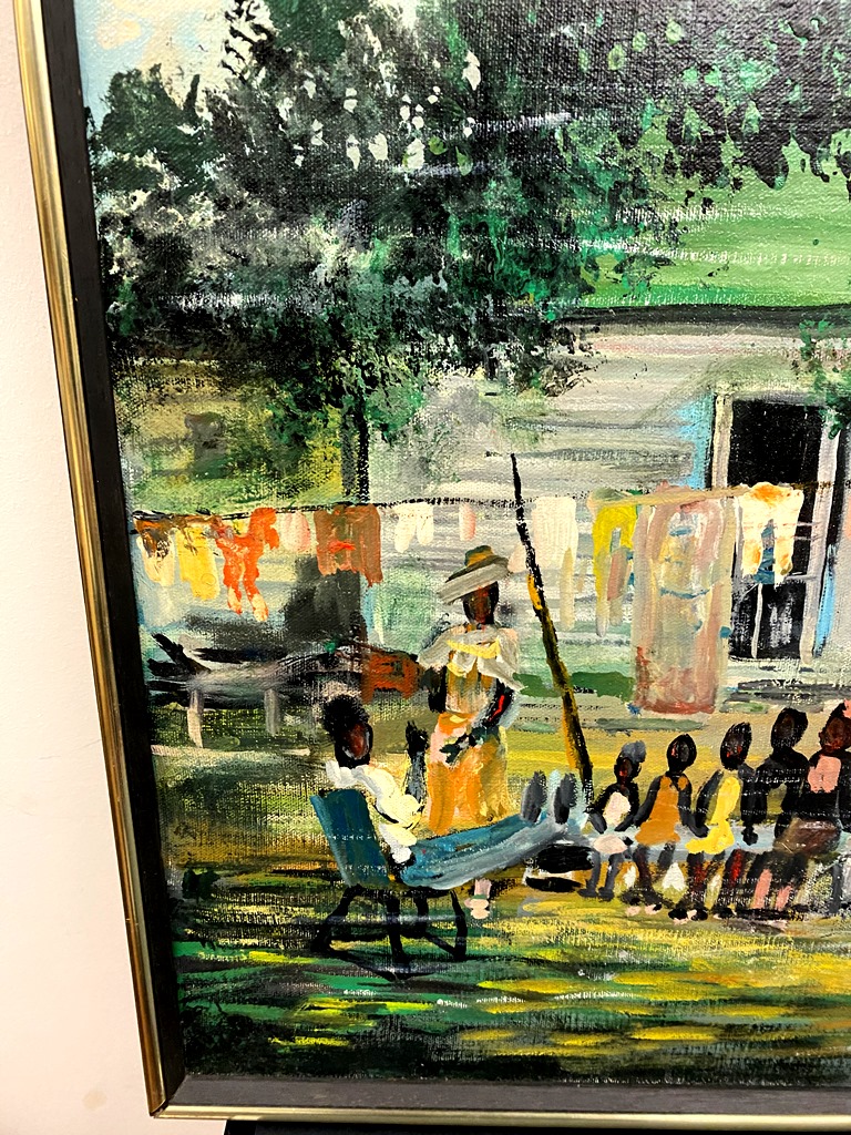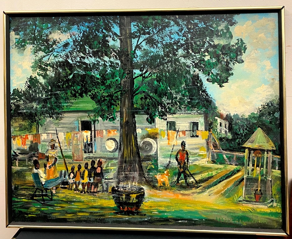 AMERICAN SCHOOL (mid 20th century). Communal Scene of African American life in a Rural Setting. Oil on canvas depicting a lively scene in a rural setting centered around a large tree; it is a communal scene of African American life in a rural setting. The background features a simple white house with multiple lines of colorful laundry hanging to dry, emphasizing the domestic and daily activities of the community. indecipherable signature lower right. Framed. - 22 x 28 inches; frame: 24 x 30 inches Estimate $200-300