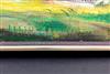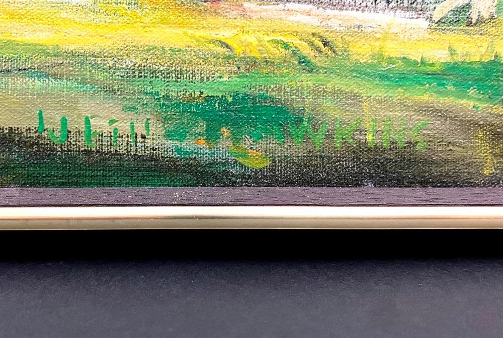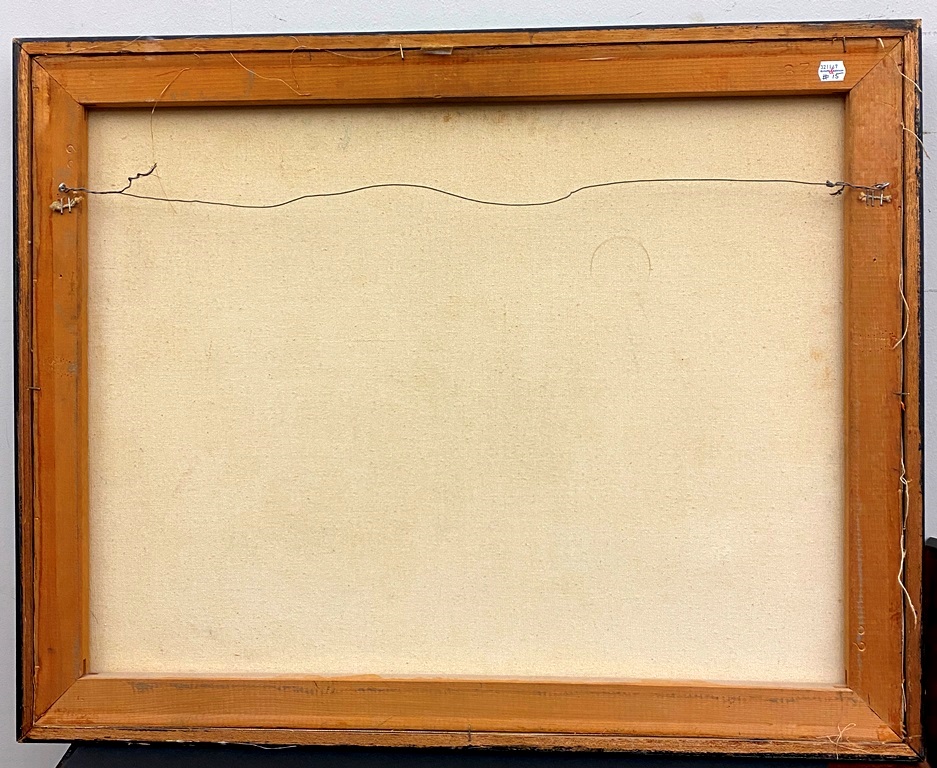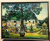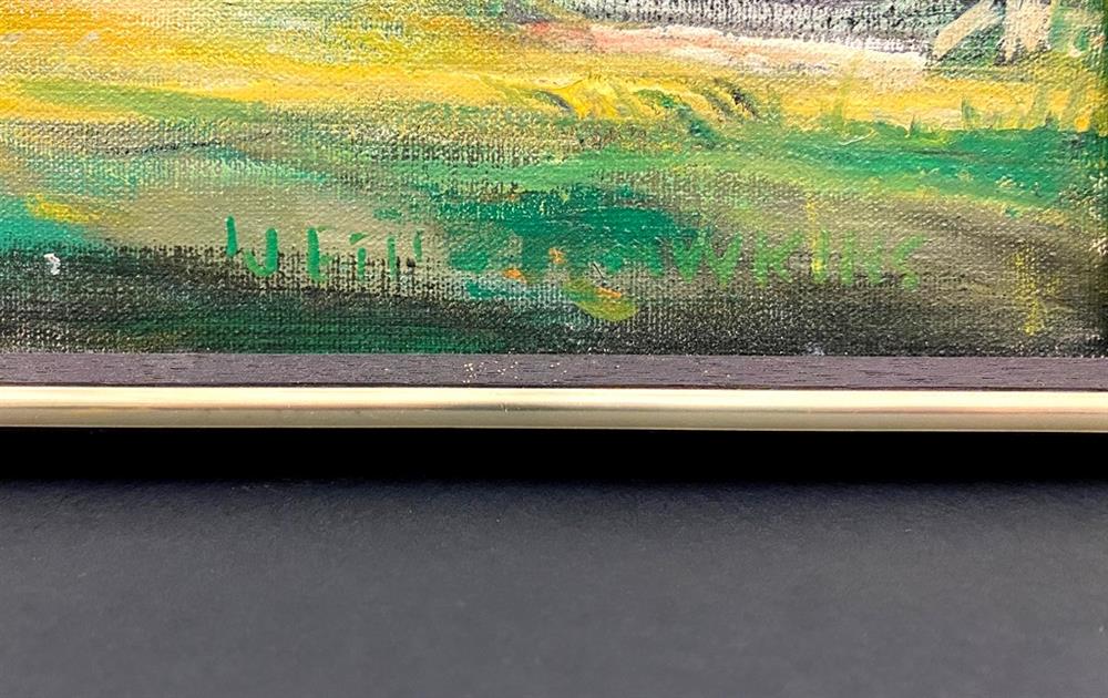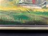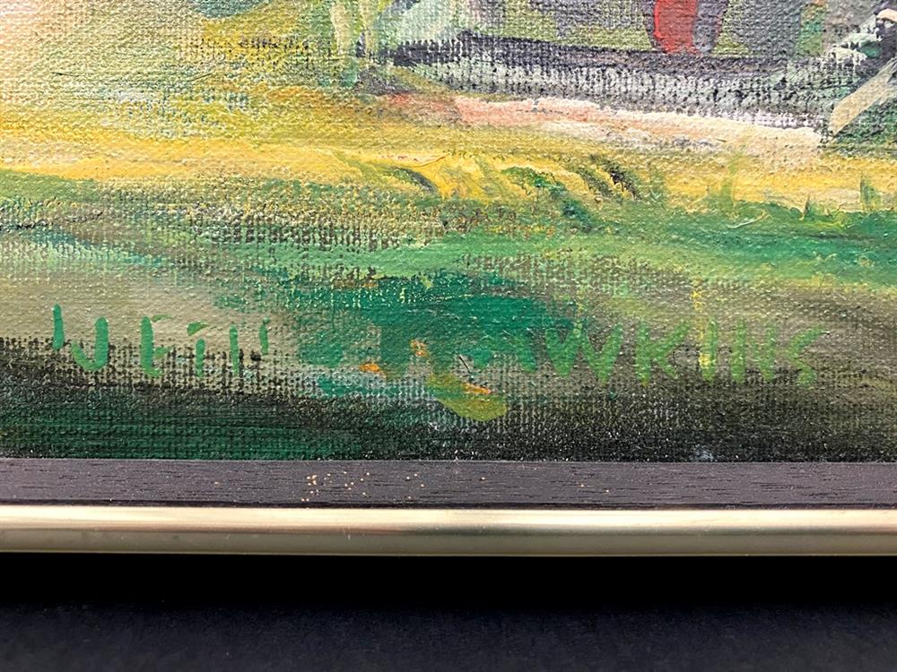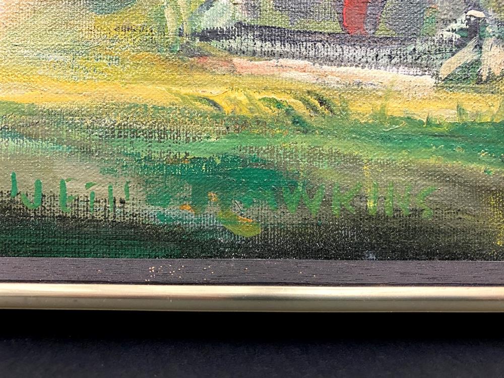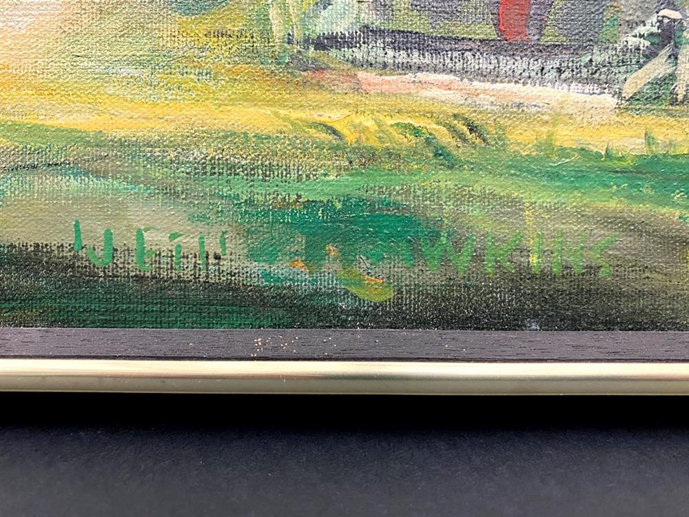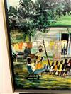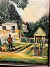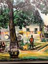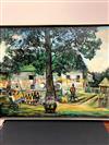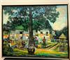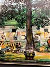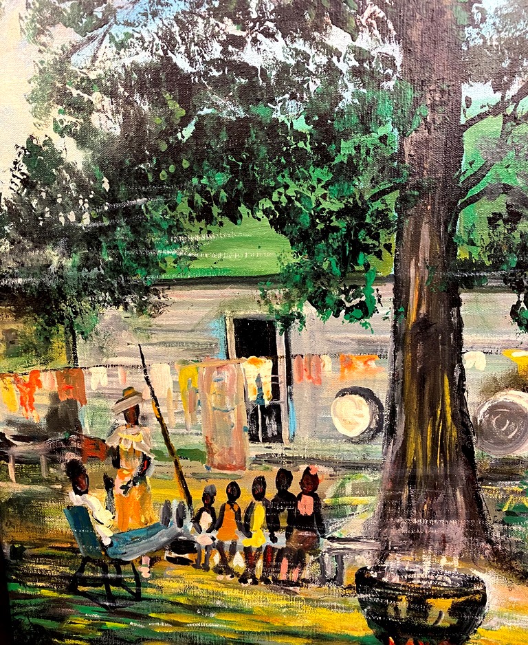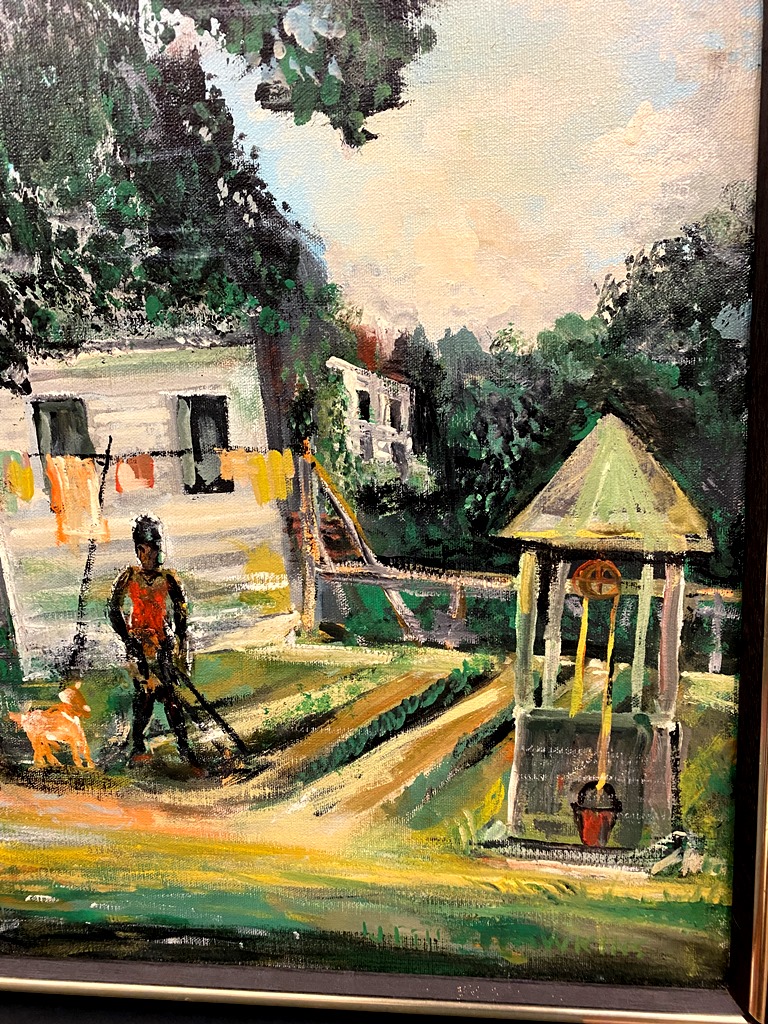 AMERICAN SCHOOL (mid 20th century). Communal Scene of African American life in a Rural Setting. Oil on canvas depicting a lively scene in a rural setting centered around a large tree; it is a communal scene of African American life in a rural setting. The background features a simple white house with multiple lines of colorful laundry hanging to dry, emphasizing the domestic and daily activities of the community. indecipherable signature lower right. Framed. - 22 x 28 inches; frame: 24 x 30 inches Estimate $200-300