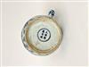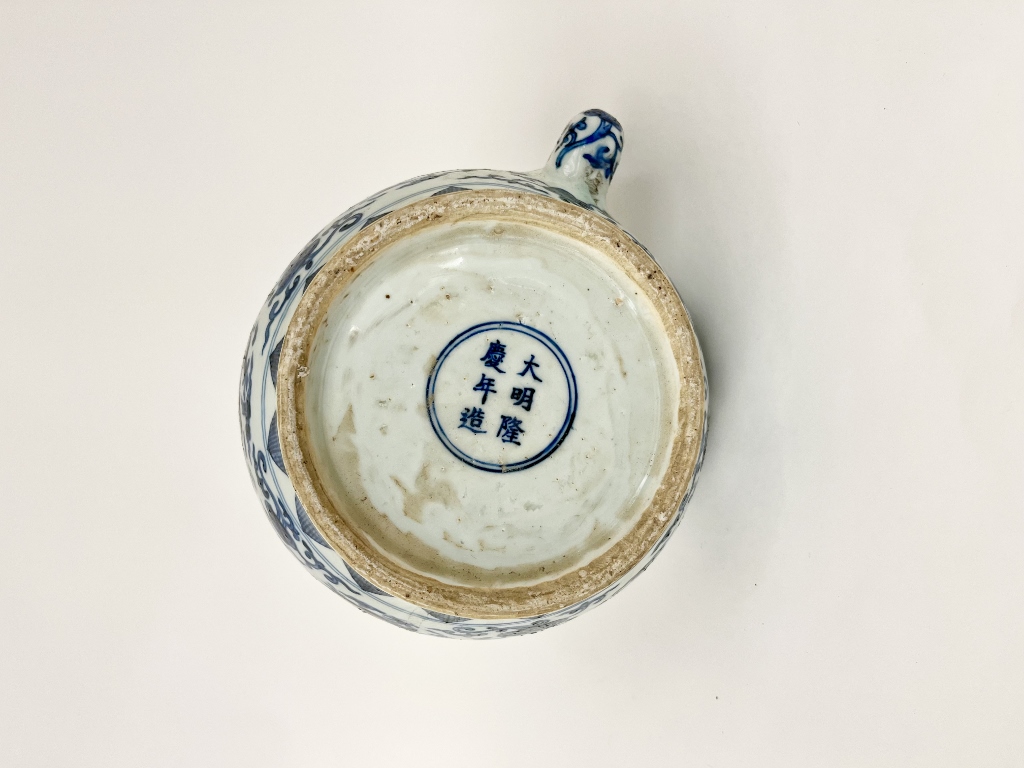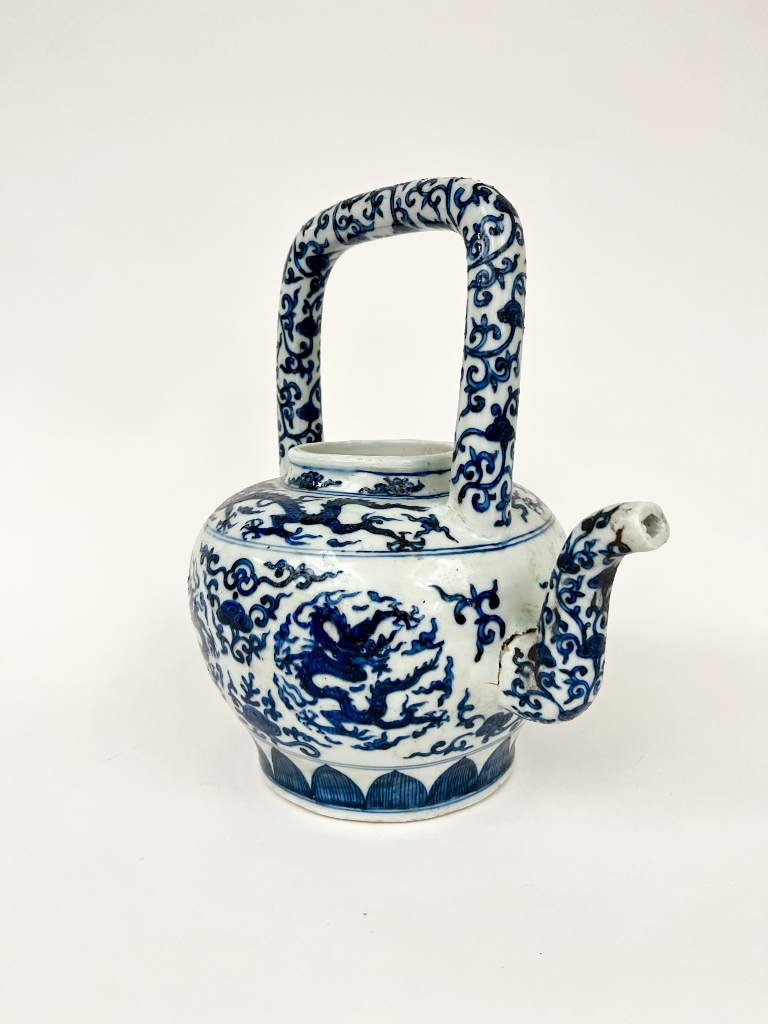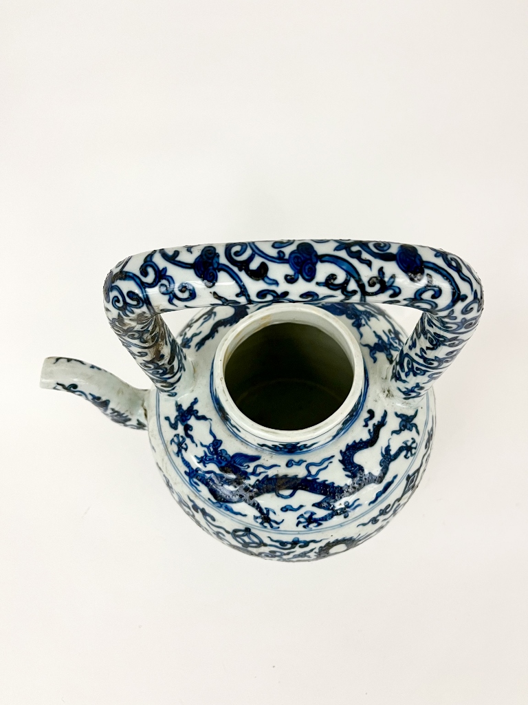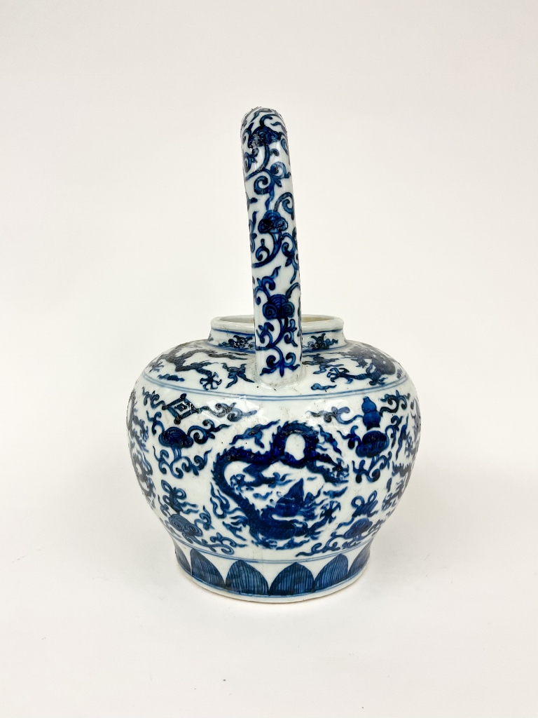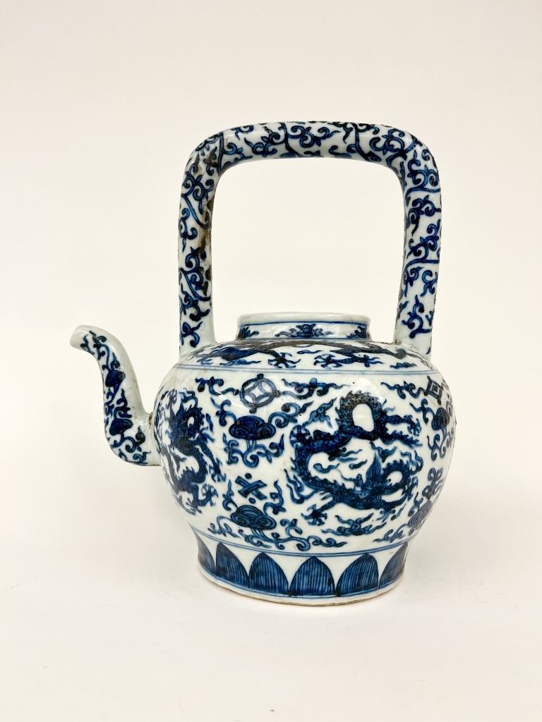CHINESE BLUE AND WHITE PORCELAIN APPLE FORM TEAPOT. Rigid, squared handle; overall decoration of writhing dragons and trailing vines. - H: 12".Estimate $150-250