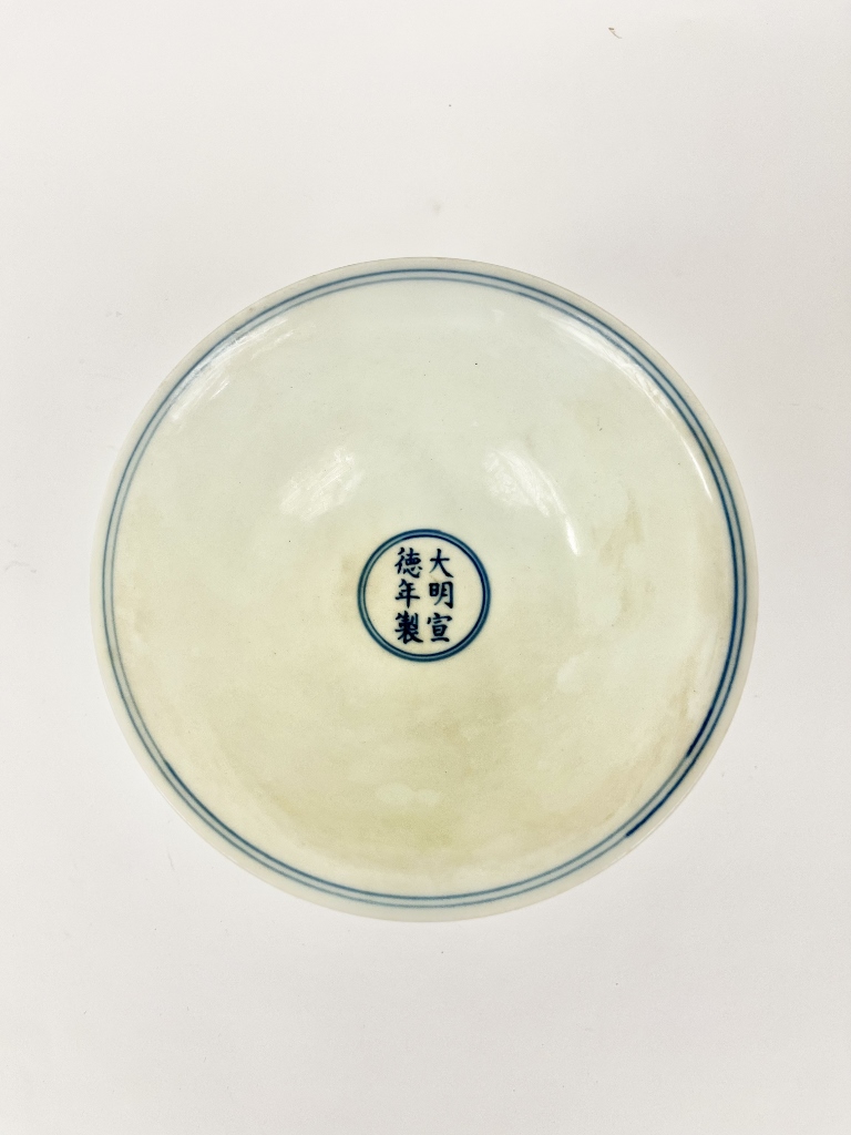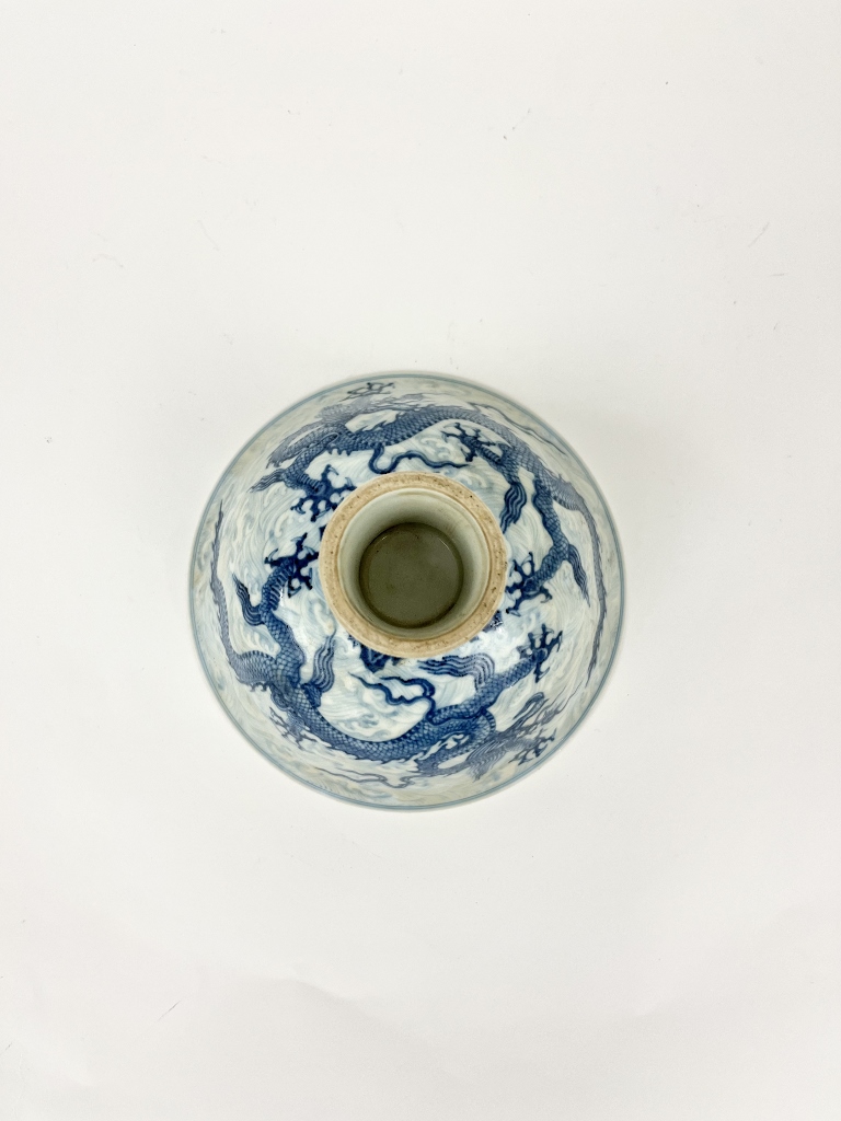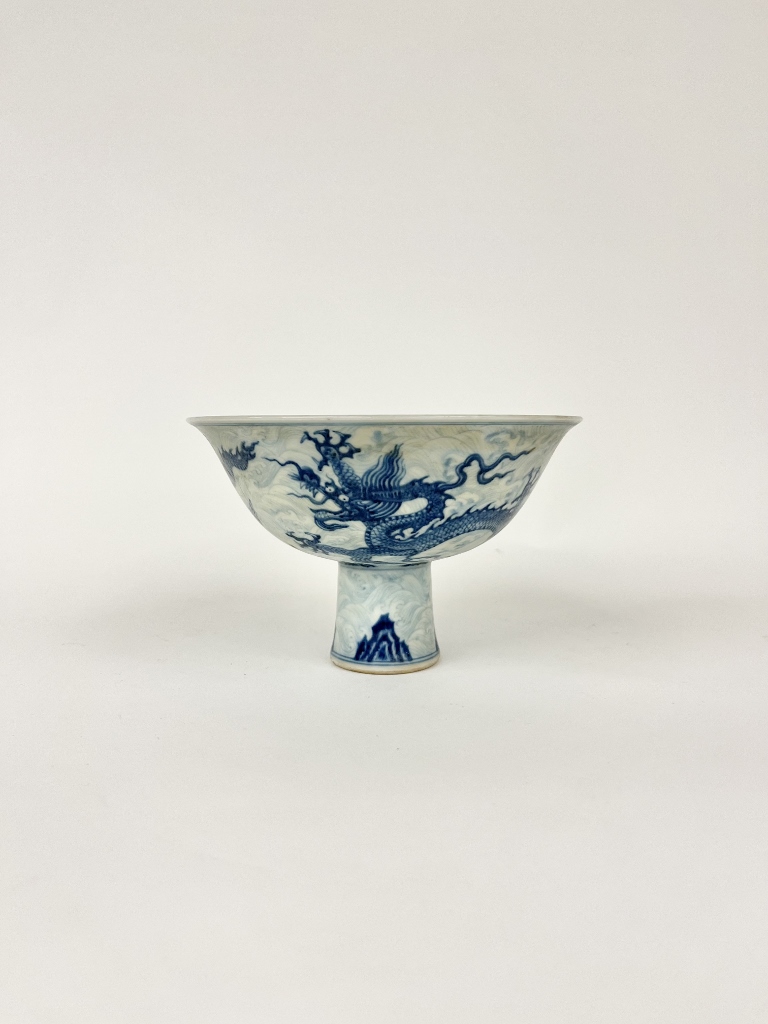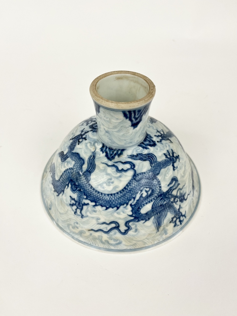 CHINESE BLUE AND WHITE PORCELAIN STEM CUP. Exterior with decoration of five-toed writhing dragons; interior with six-character mark within reserve. - D: 6 1/8".Estimate $100-200