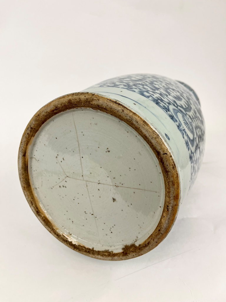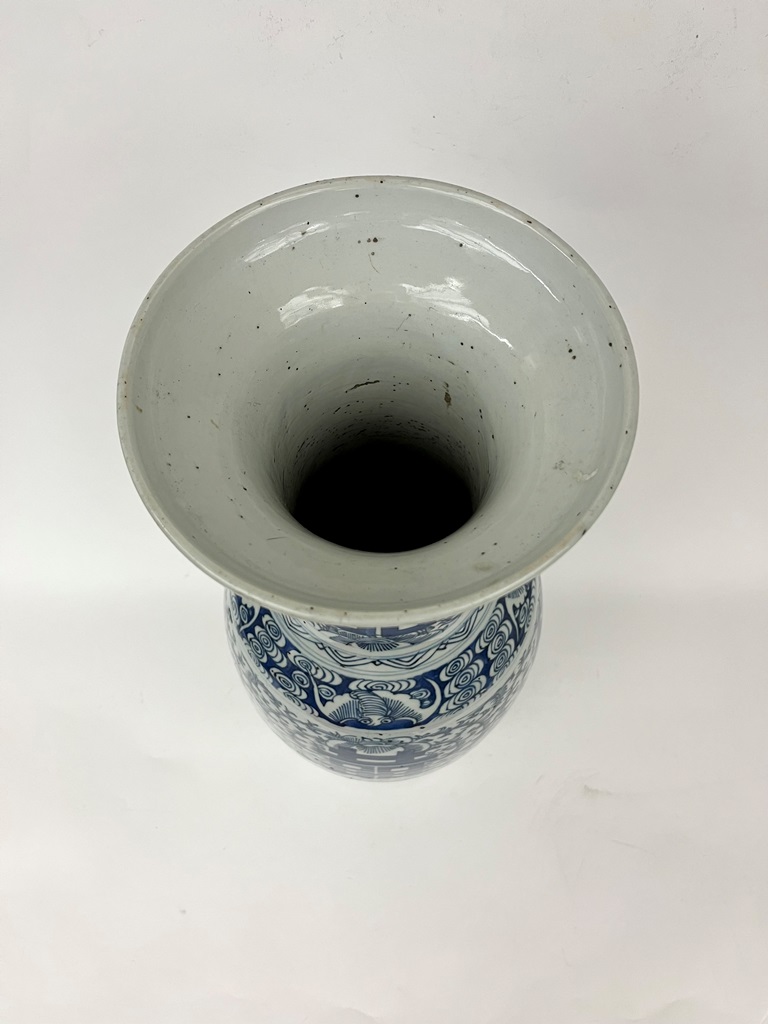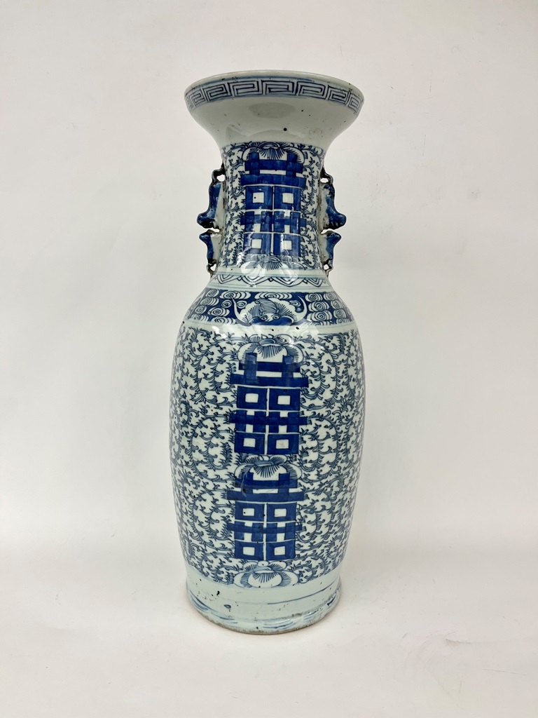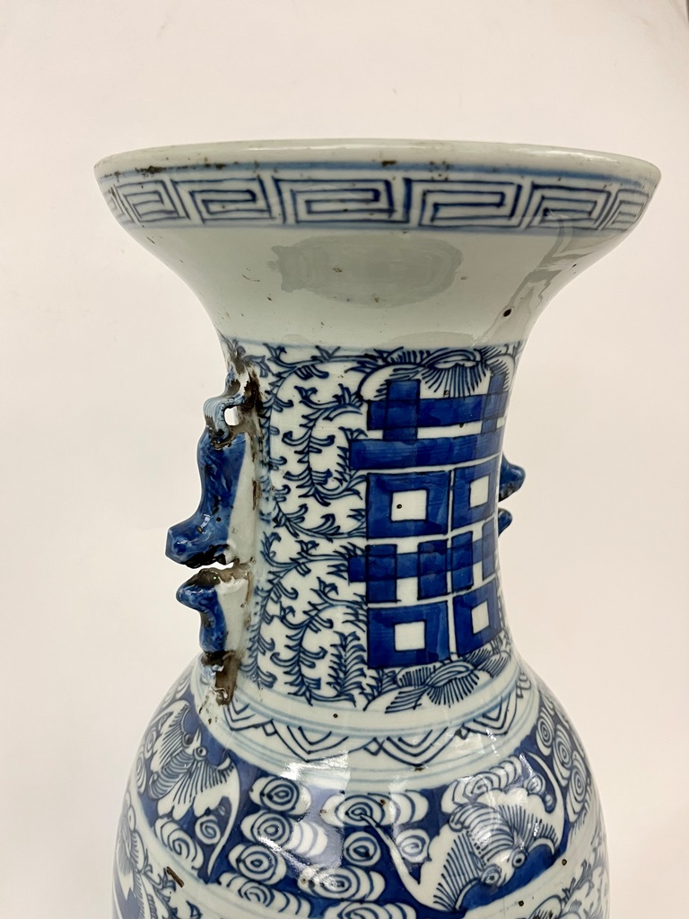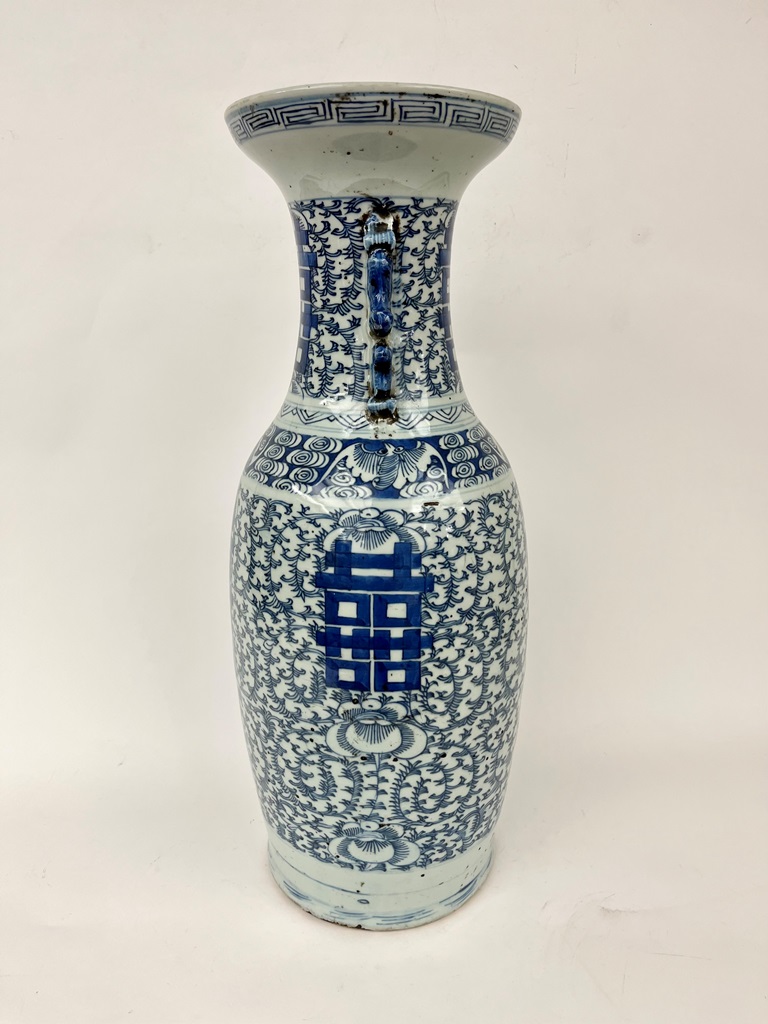 CHINESE BLUE AND WHITE PORCELAIN TWO-HANDLE BALUSTER-FORM VASE. Character motifs centered by trailing, scrolling vines. H> 23 1/4 in.Estimate $150-250