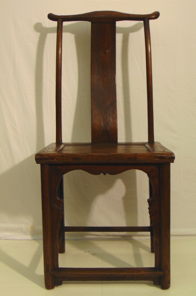 CHINESE CARVED ELMWOOD TWO-DRAWER WRITING DESK AND CO-ORDINATING CHAIR. Desk has rectangular top with flush panel, over pair aligned full-width drawers with carved floral pattern; iron ring pulls and mounts - H: 34 in. Top, 42 1/4 in. x 18 1/2 in. Estimate $200-300
