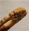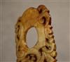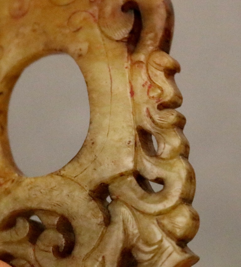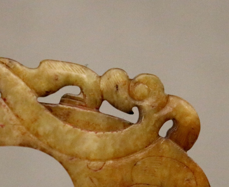 CHINESE EASTERN HAN DYNASTY JADE "SHE" ARCHER'S RING. Patinated and incised yellow jade, "She" archer's ring with Chi dragon design. Eastern Han dynasty. Height: 7.8 cm, 3 inches. Reference: 'Chinese Jade Selected articles from Orientations 1983-1996" "Jades from the Lan Tien Shan Fang Collection" p. 163, fig. 7. Note: The Han dynasty was a Chinese imperial dynasty that ruled from 206 BCE to 220 CE. NOTE: A copy of the consignor's purchase receipt will be provided upon request. Estimate $300-400 PROVENANCE: Acquired in the early 1990s from Frank H. Crane's "The Hundred Antiques" store (Stirling, Ontario, Canada). Mr. Crane was a frequent visitor to Hong Kong where he acquired Archaic jades mainly from Mr. Lai Loy's well known and prominent shop near the Man Mo Temple on Hollywood Road. Mr. Lai (Chinese, 1926-2012) was the descendant of antique dealers from Guangzhou, China. In 2005, stones from the collection were verbally authenticated by Dr. Sarah Milledge Nelson (American, 1931 - 2020), a noted archaeologist and Distinguished Professor Emerita from the Department of Anthropology, University of Denver.