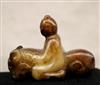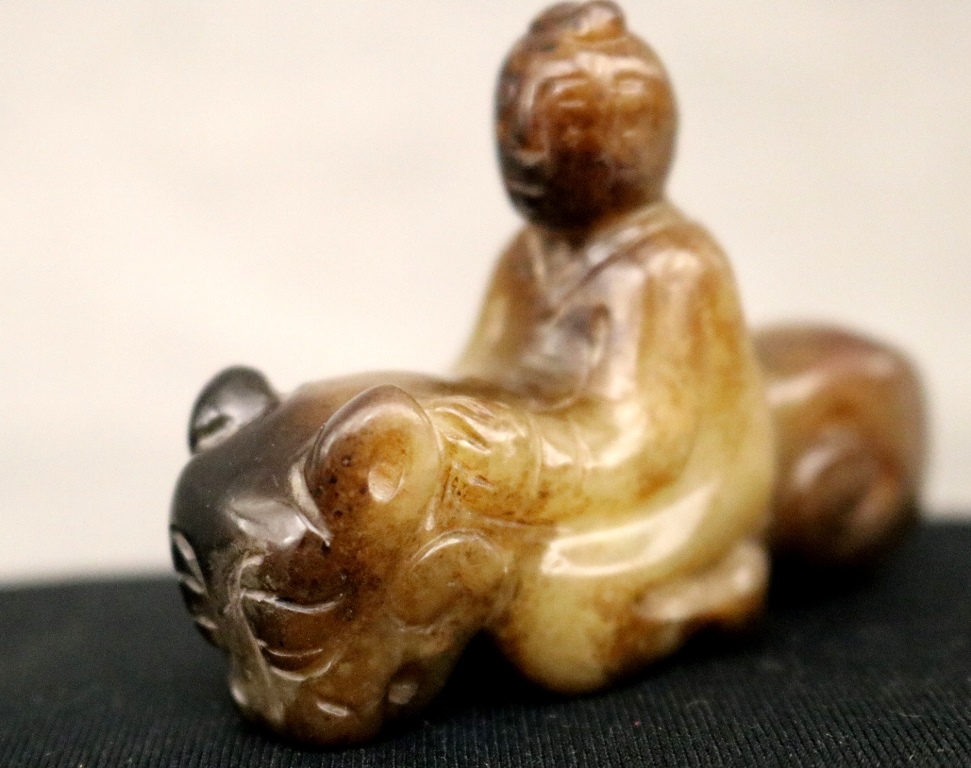 CHINESE EASTERN ZHOU JADE MAN ON IMAGINARY BEAST. Patinated green and blackish jade figure of a man mounted on an imaginary beast. Eastern Zhou dynasty. Length: 6.5 cm, 2 ΒΌ inches. Reference: Jessica Rawson "Chinese Jades from the Neolithic to the Qing", 1995. p.361, fig.2. Note: The Eastern Zhou[a] (c.?771 - 256 BCE) is a period in Chinese history comprising the latter half of the Zhou dynasty, following the Zhou royal court's relocation eastward to Chengzhou, near present-day Luoyang. NOTE: A copy of the consignor's purchase receipt will be provided upon request. Estimate $300-500 PROVENANCE: Acquired in the early 1990s from Frank H. Crane's "The Hundred Antiques" store (Stirling, Ontario, Canada). Mr. Crane was a frequent visitor to Hong Kong where he acquired Archaic jades mainly from Mr. Lai Loy's well known and prominent shop near the Man Mo Temple on Hollywood Road. Mr. Lai (Chinese, 1926-2012) was the descendent of antique dealers from Guangzhou, China. In 2005, stones from the collection were verbally authenticated by Dr. Sarah Milledge Nelson (American, 1931 - 2020), a noted archaeologist and Distinguished Professor Emerita from the Department of Anthropology, University of Denver.