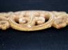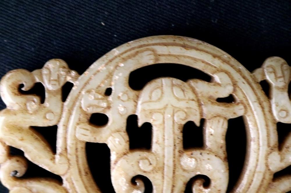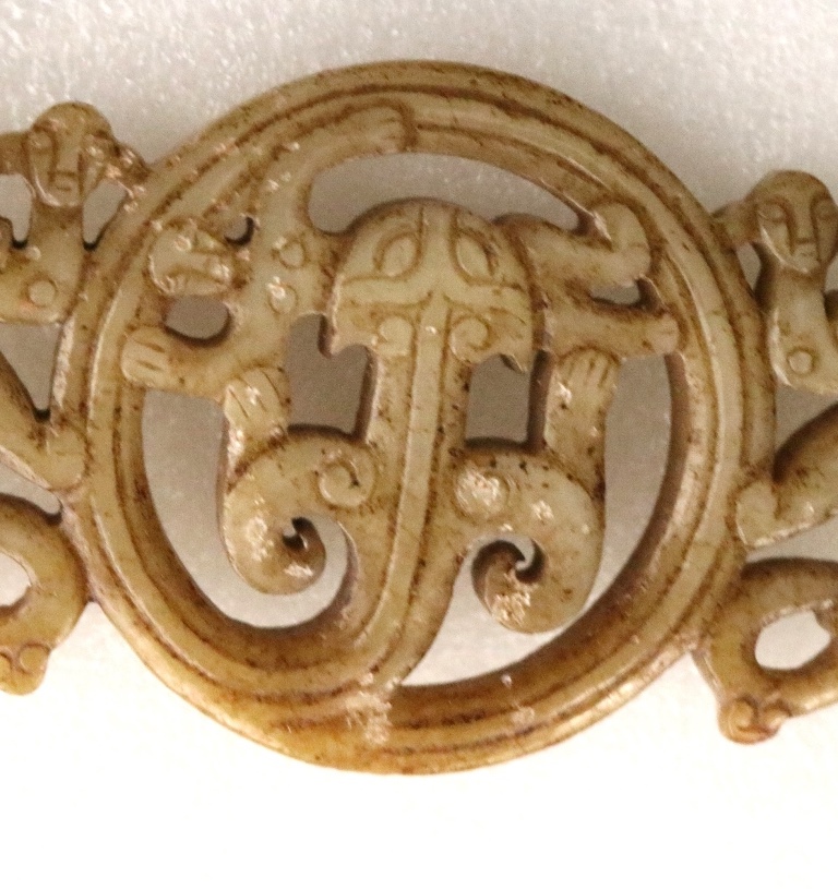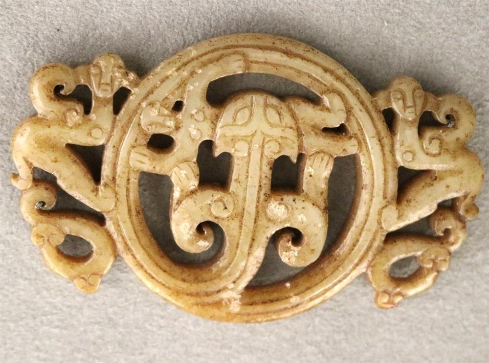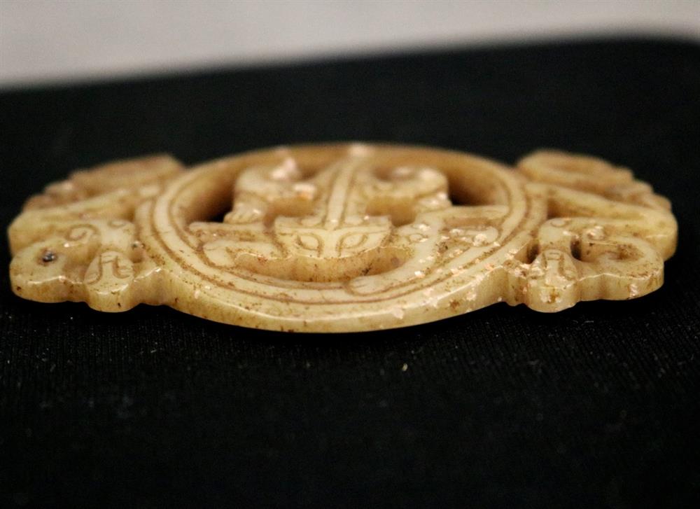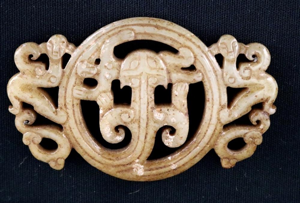 CHINESE EASTERN ZHOU JADE OPENWORK PENDANT. Patinated and incised beige color jade openwork pendant comprising a coiled monster with a figure of a man in its jars. On either side are winged human-headed figures. Eastern Zhou period. Width: 7.2 cm, 2 7/16 inches; Reference: Jessica Rawson "Chinese Jades from the Neolithic to the Qing" p. 68, fig.54. British Museum Collection. Note: The Eastern Zhou[a] (c.?771 - 256 BCE) is a period in Chinese history comprising the latter half of the Zhou dynasty, following the Zhou royal court's relocation eastward to Chengzhou, near present-day Luoyang. NOTE: A copy of the consignor's purchase receipt will be provided upon request. Estimate $300-500 PROVENANCE: Acquired in the early 1990s from Frank H. Crane's "The Hundred Antiques" store (Stirling, Ontario, Canada). Mr. Crane was a frequent visitor to Hong Kong where he acquired Archaic jades mainly from Mr. Lai Loy's well known and prominent shop near the Man Mo Temple on Hollywood Road. Mr. Lai (Chinese, 1926-2012) was the descendent of antique dealers from Guangzhou, China. In 2005, stones from the collection were verbally authenticated by Dr. Sarah Milledge Nelson (American, 1931 - 2020), a noted archaeologist and Distinguished Professor Emerita from the Department of Anthropology, University of Denver.