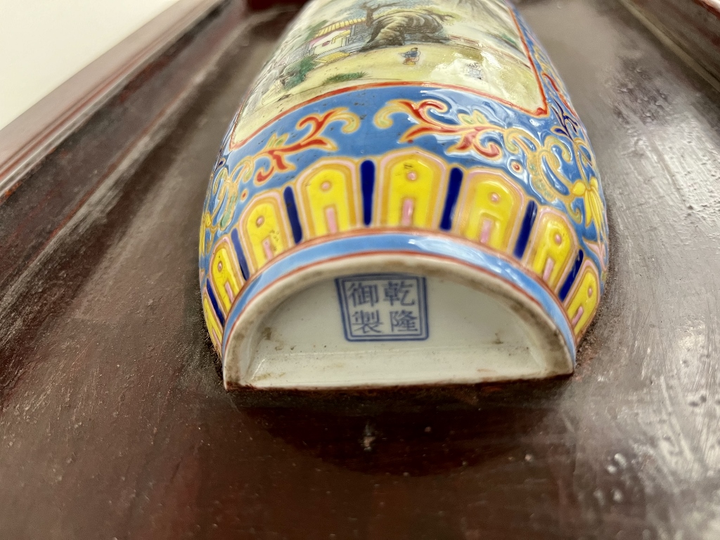 CHINESE FAMILLE ROSE PORCELAIN BALUSTER FORM WALL VASE CENTERED IN TEAKWOOD FRAME. Reserve of landscape decoration. - Frame, 17 3/4" x 10 3/4".Estimate $150-250
