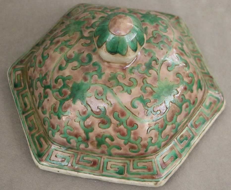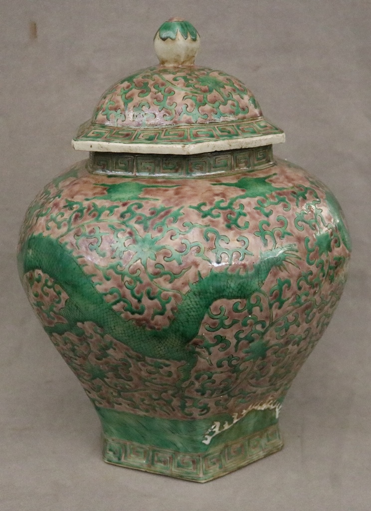 CHINESE FAMILLE VERTE PORCELAIN HEXAGONALLY-PANELED JAR WITH CONFORMING LIFT COVER. Mottled brown glaze with decoration of pair green five-toed dragons - H: 17 in.Estimate $150-250