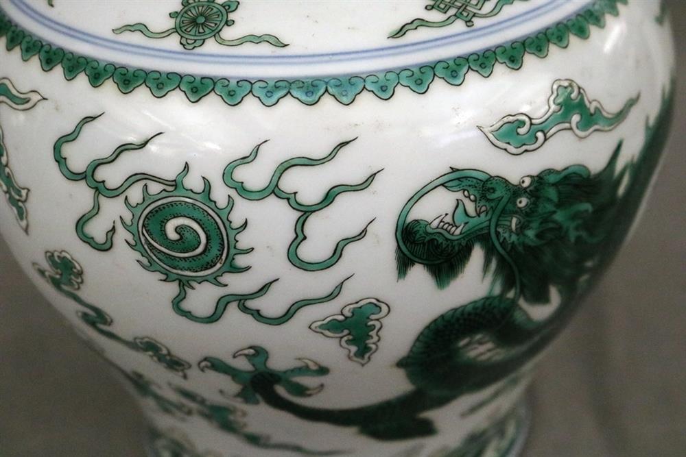 CHINESE FAMILLE VERTE PORCELAIN JAR WITH DECORATION OF GREEN IMPERIAL DRAGON CHASING FLAMING PEARL OF WISDOM. Six-character mark under foot - H: 9 1/4 in.Estimate $100-150
