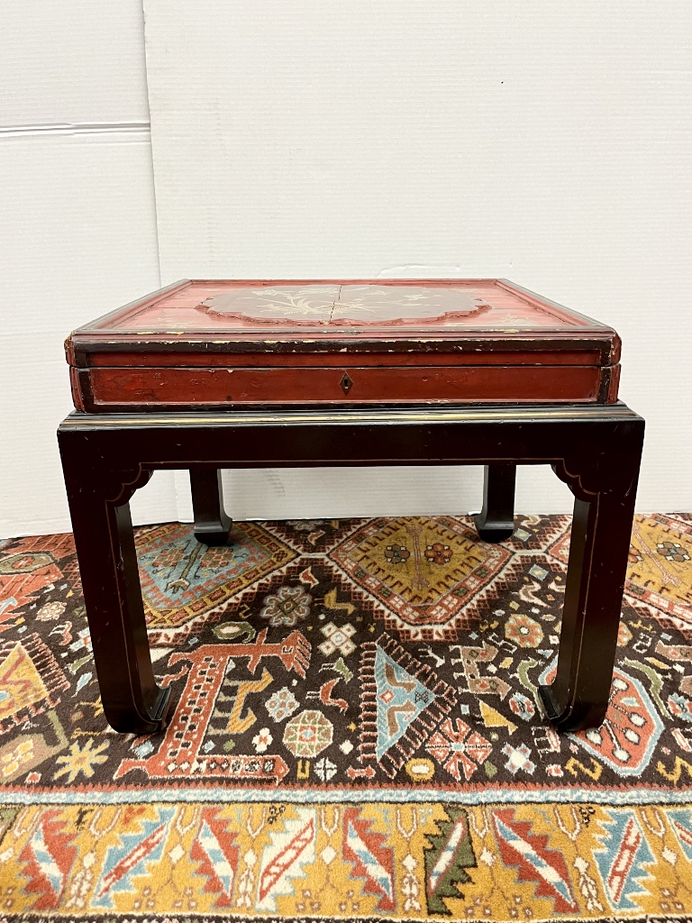 CHINESE GILT-FLORAL PAINTED AND RED LACQUERED HINGED-TOP BOX ON FITTED STAND. Top has foliate reserve enclosing flowers and butterfly centered by floral spandrels; black lacquered stand; protective glass top for use as side table. - H: 18 1/2"; 22 1/4" square. Estimate $150-250