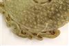 CHINESE GREEN AND RUSSET JADE BI DISC . Patinated and incised light green and russet jade bi disc is carved to the centre in openwork with a dragon and two phoenixes on the outer edges. Warring States Period to Han dynasty. Diameter: 15 cm, 6 inches. Reference: "Jadeware I. The Complete Collection of Treasures of the Palace Museum", 1995 p. 156, fig. 128. Lot is presented in a fitted box. NOTE: A copy of the consignor's purchase receipt will be provided upon request. Estimate $600-800 PROVENANCE: Acquired in the early 1990s from Frank H. Crane's "The Hundred Antiques" store (Stirling, Ontario, Canada). Mr. Crane was a frequent visitor to Hong Kong where he acquired Archaic jades mainly from Mr. Lai Loy's well known and prominent shop near the Man Mo Temple on Hollywood Road. Mr. Lai (Chinese, 1926-2012) was the descendent of antique dealers from Guangzhou, China. In 2005, stones from the collection were verbally authenticated by Dr. Sarah Milledge Nelson (American, 1931 - 2020), a noted archaeologist and Distinguished Professor Emerita from the Department of Anthropology, University of Denver.