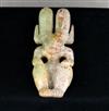 CHINESE GREEN CALCIFIED HONGSHAN CULTURE HUMANOID FIGURE. Light green calcified jade of a humanoid figure, "Ba Jian" with an animal-like head seated in an upright position. Has a horizontal perforation through the neck and another perforation on the base. Hongshan culture. Height: 12.3 cm, 4 8/16 inches (box). Reference: National Palace Museum Beijing and Ostasiatiska Museum, Stockholm, Sweden. Note: The Hongshan culture was a Neolithic culture in the West Liao River basin in northeast China. Hongshan sites have been found in an area stretching from Inner Mongolia to Liaoning, and dated from about 4700 to 2900 BC. Lot is presented in a fitted box. NOTE: A copy of the consignor's purchase receipt will be provided upon request. Estimate $400-600 PROVENANCE: Acquired in the early 1990s from Frank H. Crane's "The Hundred Antiques" store (Stirling, Ontario, Canada). Mr. Crane was a frequent visitor to Hong Kong where he acquired Archaic jades mainly from Mr. Lai Loy's well known and prominent shop near the Man Mo Temple on Hollywood Road. Mr. Lai (Chinese, 1926-2012) was the descendent of antique dealers from Guangzhou, China. In 2005, stones from the collection were verbally authenticated by Dr. Sarah Milledge Nelson (American, 1931 - 2020), a noted archaeologist and Distinguished Professor Emerita from the Department of Anthropology, University of Denver.