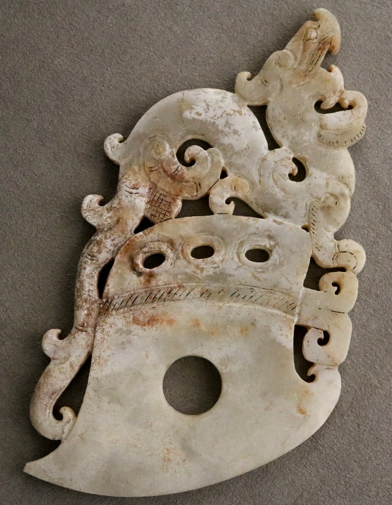 CHINESE HAN DYNASTY CALCIFIED JADE AXE. Patinated and incised greenish white calcified jade Axe, Yue, decorated with a dragon. Han dynasty. Height: 16 cm, 6 2/16 inches. Note: tip of the axe end is broken off. Note: The Han dynasty was a Chinese imperial dynasty that ruled from 206 BCE to 220 CE. NOTE: A copy of the consignor's purchase receipt will be provided upon request. Estimate $600-800 PROVENANCE: Acquired in the early 1990s from Frank H. Crane's "The Hundred Antiques" store (Stirling, Ontario, Canada). Mr. Crane was a frequent visitor to Hong Kong where he acquired Archaic jades mainly from Mr. Lai Loy's well known and prominent shop near the Man Mo Temple on Hollywood Road. Mr. Lai (Chinese, 1926-2012) was the descendent of antique dealers from Guangzhou, China. In 2005, stones from the collection were verbally authenticated by Dr. Sarah Milledge Nelson (American, 1931 - 2020), a noted archaeologist and Distinguished Professor Emerita from the Department of Anthropology, University of Denver.