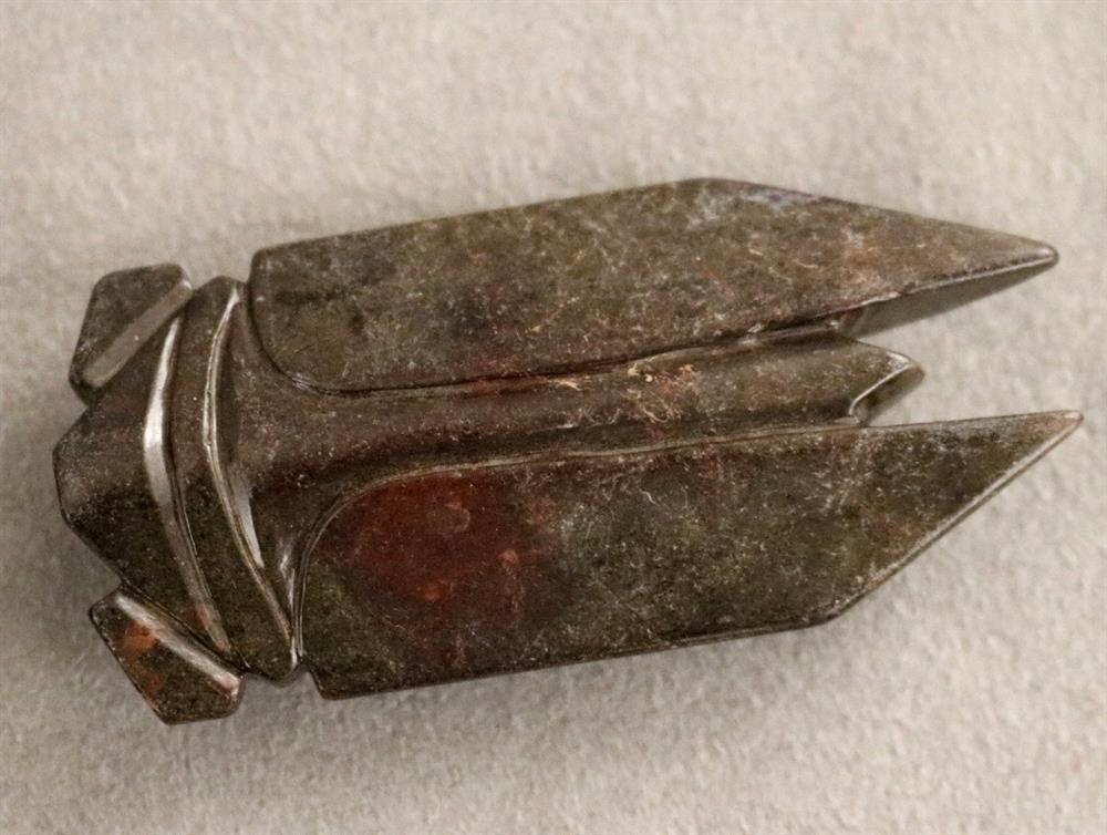 CHINESE HAN DYNASTY JADE CICADA. Patinated and incised brown jade Cicada, Han dynasty, Height 7.5 cm, 3 inches. Reference: Jessica Rawson "Chinese Jades from the Neolithic to the Qing", 1995 p. 319, fig. 24:9. Note: The Han dynasty was a Chinese imperial dynasty that ruled from 206 BCE to 220 CE. NOTE: A copy of the consignor's purchase receipt will be provided upon request. Estimate $300-600 PROVENANCE: Acquired in the early 1990s from Frank H. Crane's "The Hundred Antiques" store (Stirling, Ontario, Canada). Mr. Crane was a frequent visitor to Hong Kong where he acquired Archaic jades mainly from Mr. Lai Loy's well known and prominent shop near the Man Mo Temple on Hollywood Road. Mr. Lai (Chinese, 1926-2012) was the descendent of antique dealers from Guangzhou, China. In 2005, stones from the collection were verbally authenticated by Dr. Sarah Milledge Nelson (American, 1931 - 2020), a noted archaeologist and Distinguished Professor Emerita from the Department of Anthropology, University of Denver.