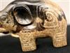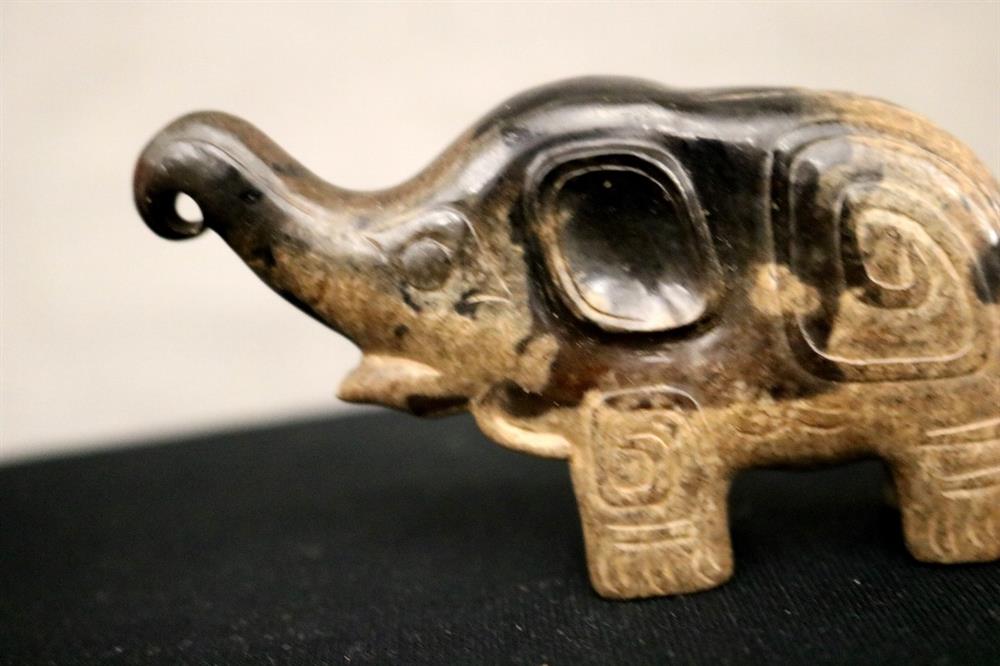 CHINESE HAN DYNASTY JADE ELEPHANT. Patinated and incised brown jade statue of an elephant. Han dynasty. Length: 7.5 cm, 3 inches. Note: The Han dynasty was a Chinese imperial dynasty that ruled from 206 BCE to 220 CE. NOTE: A copy of the consignor's purchase receipt will be provided upon request. Estimate $600-800 PROVENANCE: Acquired in the early 1990s from Frank H. Crane's "The Hundred Antiques" store (Stirling, Ontario, Canada). Mr. Crane was a frequent visitor to Hong Kong where he acquired Archaic jades mainly from Mr. Lai Loy's well known and prominent shop near the Man Mo Temple on Hollywood Road. Mr. Lai (Chinese, 1926-2012) was the descendent of antique dealers from Guangzhou, China. In 2005, stones from the collection were verbally authenticated by Dr. Sarah Milledge Nelson (American, 1931 - 2020), a noted archaeologist and Distinguished Professor Emerita from the Department of Anthropology, University of Denver.
