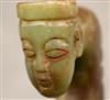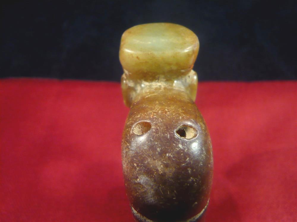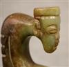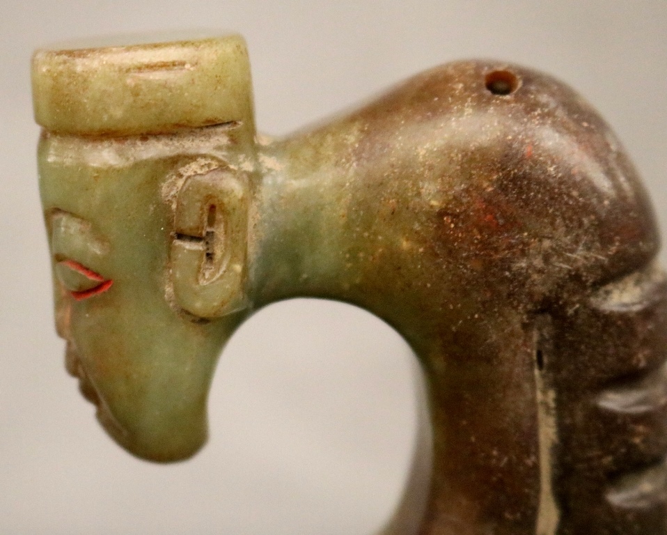 CHINESE HAN DYNASTY JADE KNEELING MAN FIGURINE. Patinated and incised green and brown jade of a kneeling figure. Han dynasty. Height: 10.5 cm, 4 1/16 inches. Note: The Han dynasty was a Chinese imperial dynasty that ruled from 206 BCE to 220 CE. NOTE: A copy of the consignor's purchase receipt will be provided upon request. Estimate $300-600 PROVENANCE: Acquired in the early 1990s from Frank H. Crane's "The Hundred Antiques" store (Stirling, Ontario, Canada). Mr. Crane was a frequent visitor to Hong Kong where he acquired Archaic jades mainly from Mr. Lai Loy's well known and prominent shop near the Man Mo Temple on Hollywood Road. Mr. Lai (Chinese, 1926-2012) was the descendent of antique dealers from Guangzhou, China. In 2005, stones from the collection were verbally authenticated by Dr. Sarah Milledge Nelson (American, 1931 - 2020), a noted archaeologist and Distinguished Professor Emerita from the Department of Anthropology, University of Denver.