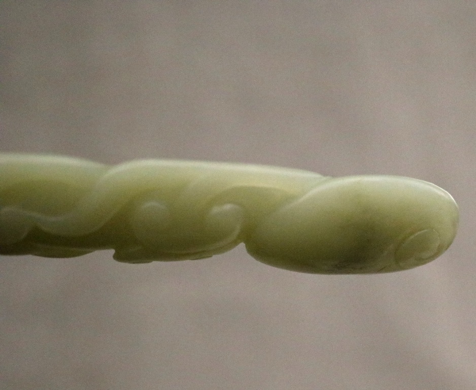 CHINESE QING DYNASTY CELADON JADE PENDANT. Patinated and finely carved pale celadon pendant. Qing dynasty. - Length: 4.5 inches.Estimate $200-300 Provenance: Washington DC collector of Chinese artifacts
