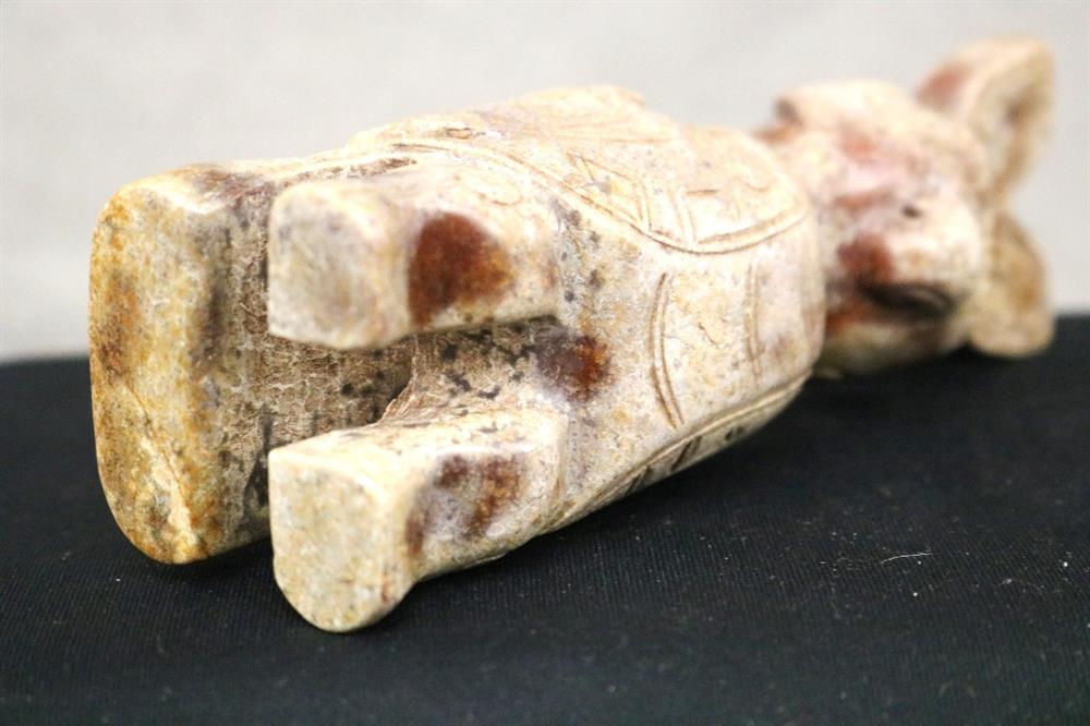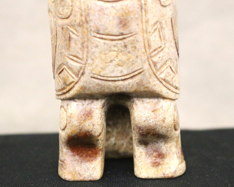 CHINESE SHANG TO WESTERN ZHOU DYNASTY STANDING MYTICAL BIRD. Patinated and incised beige color jade standing decorated figure of a mythical bird (possibly a standing owl). Shang to Western Zhou dynasty. Height: 14.5cm, 5 6/16 inches. Note: The Western Zhou (circa.?1046[1] - 771 BC) was a period of Chinese history corresponding roughly to the first half of the Zhou dynasty. NOTE: A copy of the consignor's purchase receipt will be provided upon request. Estimate $600-800 PROVENANCE: Acquired in the early 1990s from Frank H. Crane's "The Hundred Antiques" store (Stirling, Ontario, Canada). Mr. Crane was a frequent visitor to Hong Kong where he acquired Archaic jades mainly from Mr. Lai Loy's well known and prominent shop near the Man Mo Temple on Hollywood Road. Mr. Lai (Chinese, 1926-2012) was the descendent of antique dealers from Guangzhou, China. In 2005, stones from the collection were verbally authenticated by Dr. Sarah Milledge Nelson (American, 1931 - 2020), a noted archaeologist and Distinguished Professor Emerita from the Department of Anthropology, University of Denver.