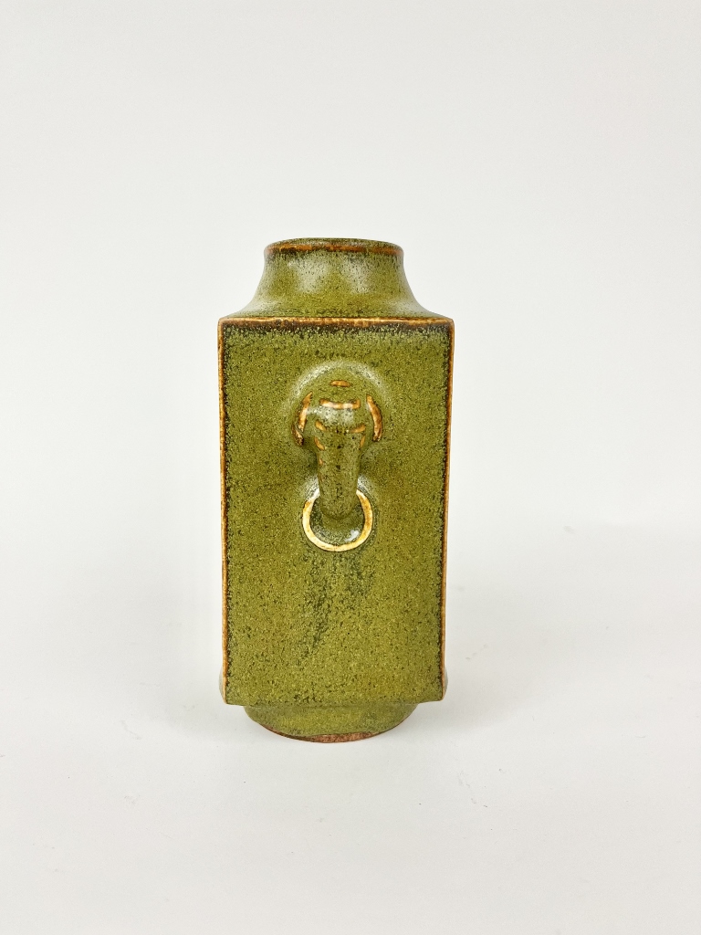 CHINESE TEA DUST GLAZE PORCELAIN CONG-SHAPE VASE. Projecting elephant-head handles; ring foot. - H: 5 1/2".Estimate $150-250